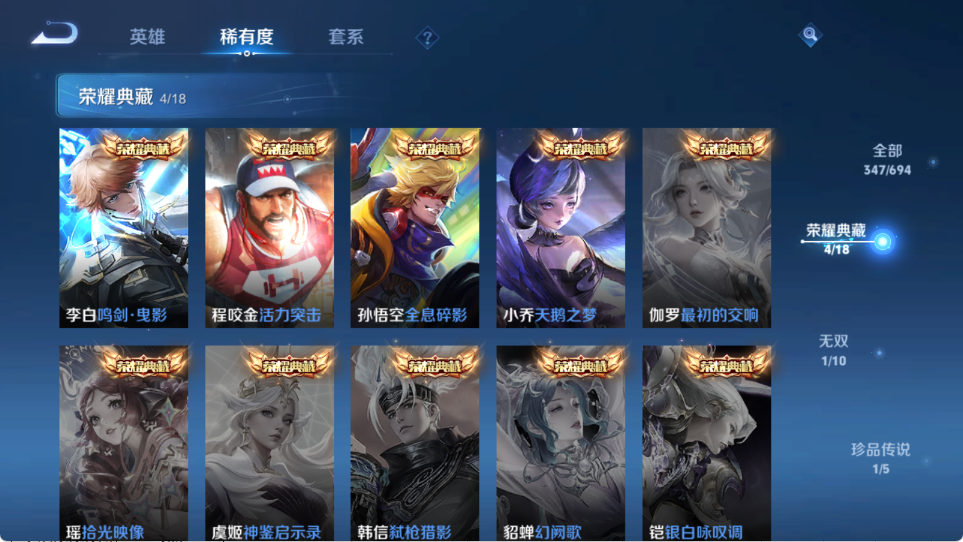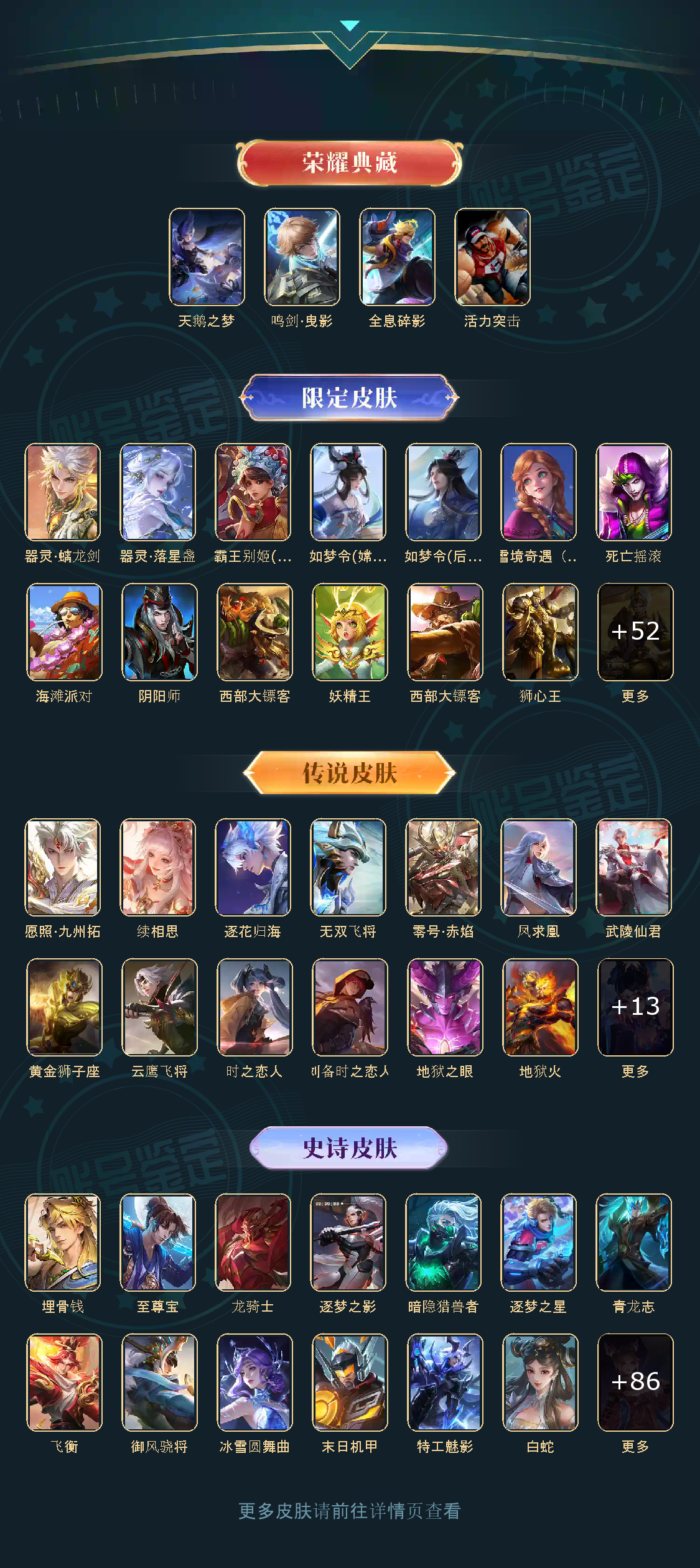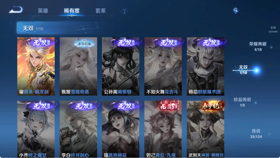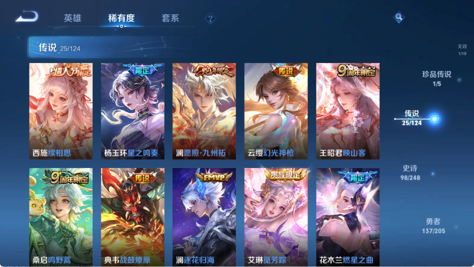 贵族等级V10,英雄数量124,典藏皮肤数4,皮肤数量349,街头霸王/天鹅之梦/至尊宝/凤求凰/逐梦之影/武陵仙君/黄金狮子座/全息碎影/青龙志/活力突击/飞衡/梁祝/鸣剑·曳影