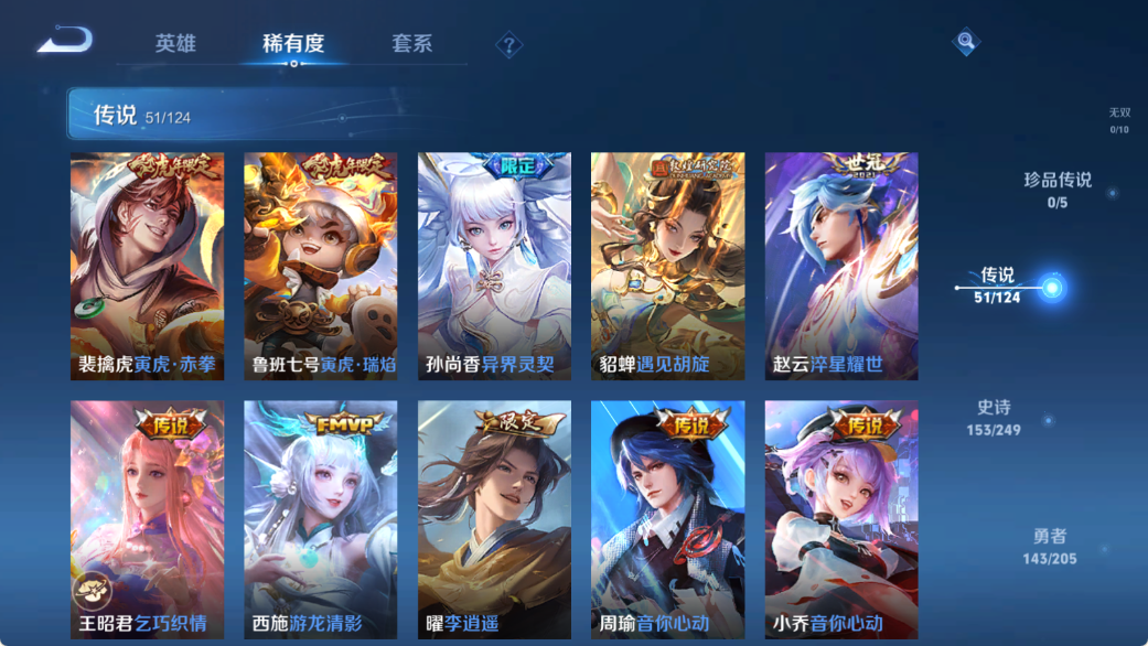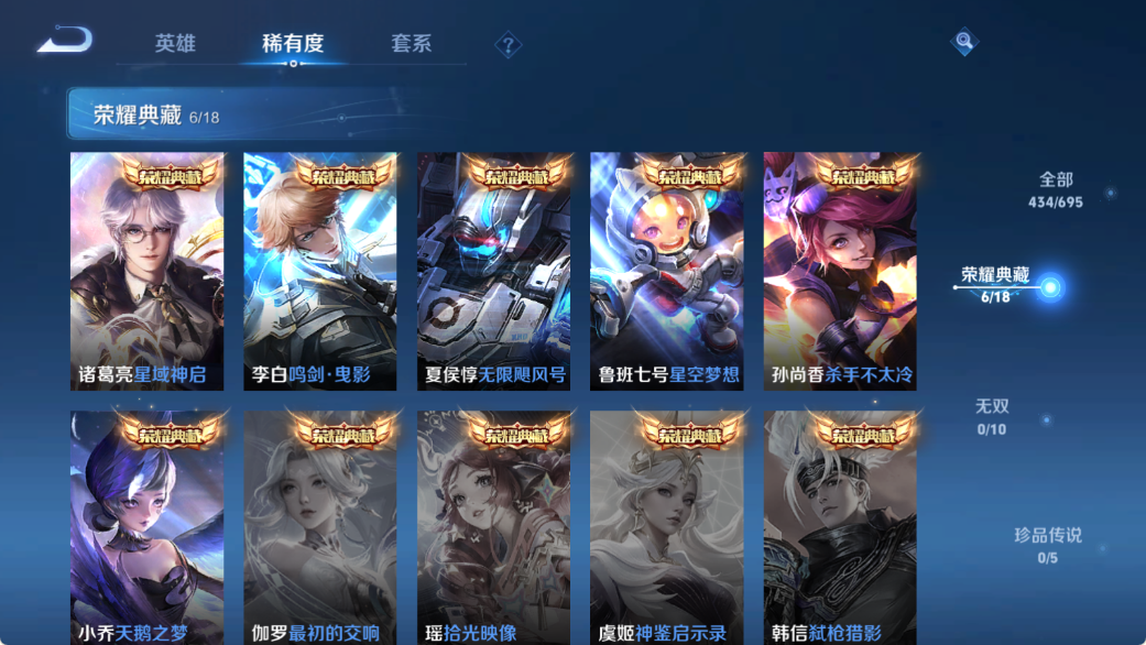 贵族等级V10,英雄数量123,典藏皮肤数6,皮肤数量434,天鹅之梦/杀手不太冷/星空梦想/无限飓风号/鸣剑·曳影/补天/启示之音