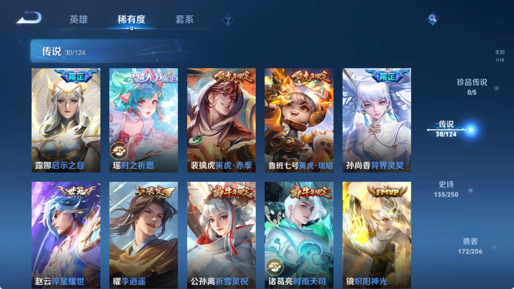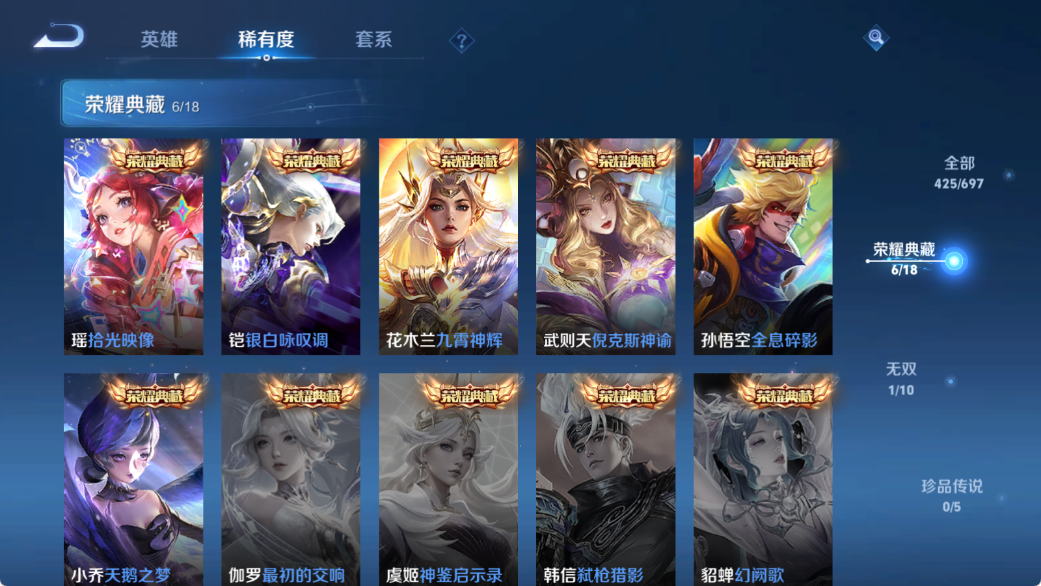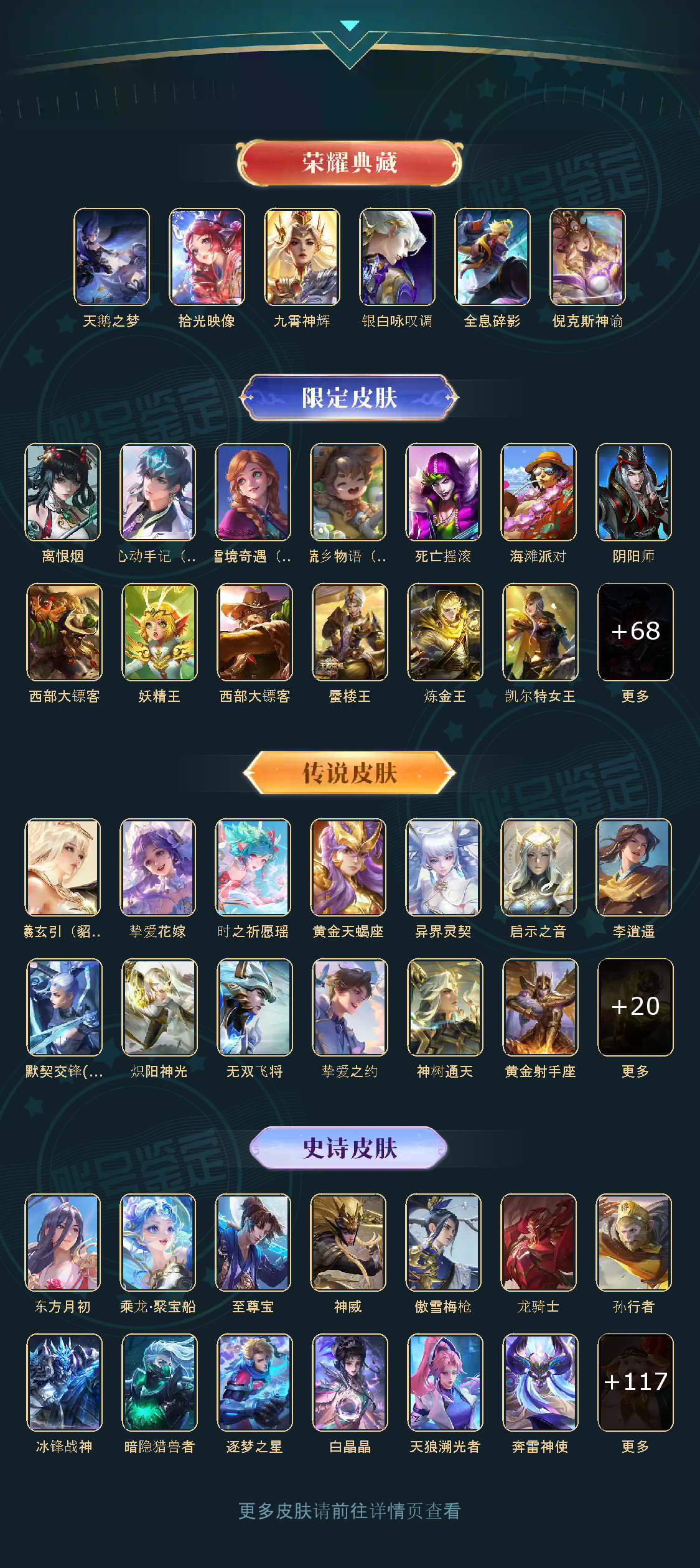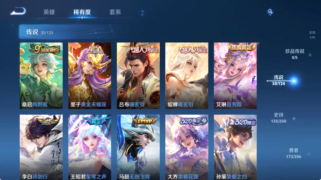 贵族等级V10,英雄数量124,典藏皮肤数6,皮肤数量425,天鹅之梦/全息碎影/倪克斯神谕/李逍遥