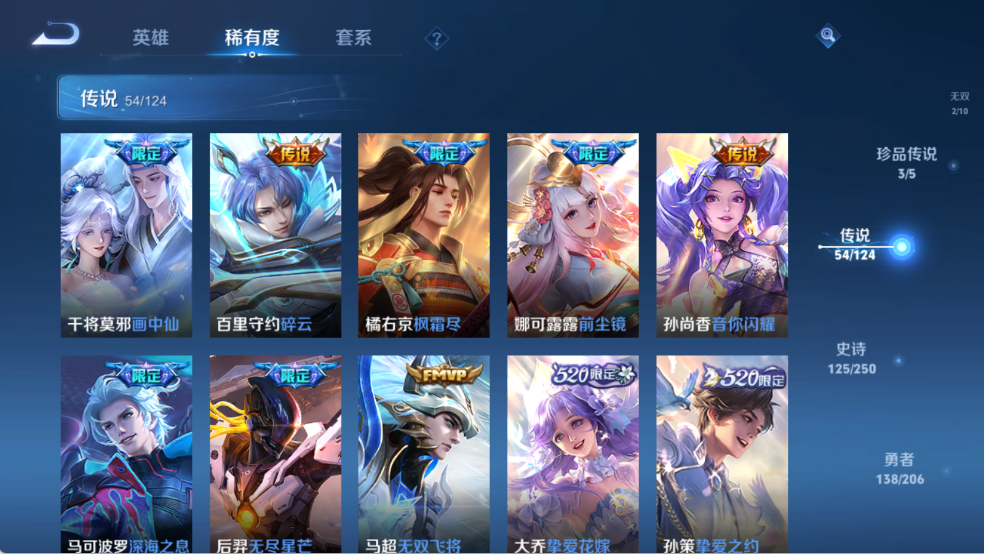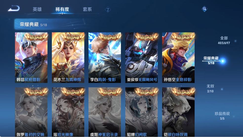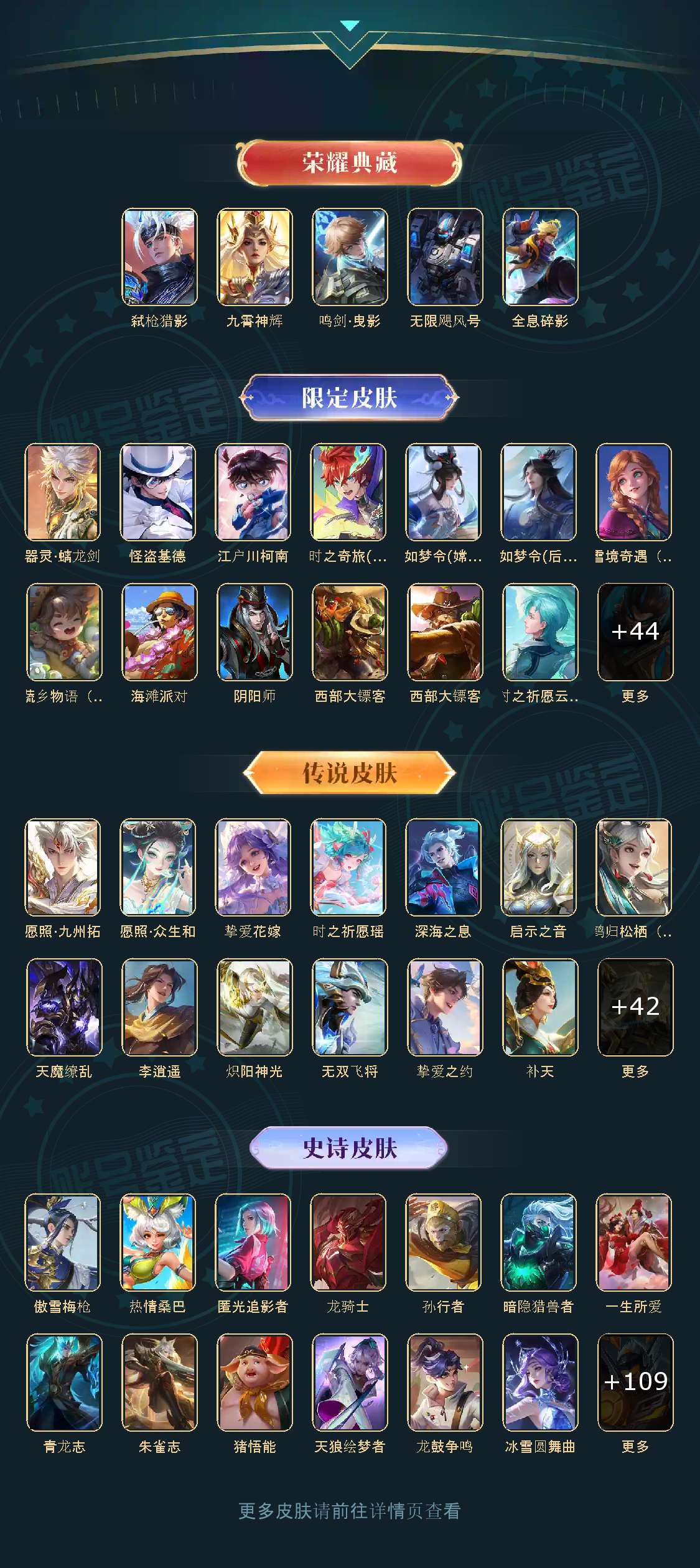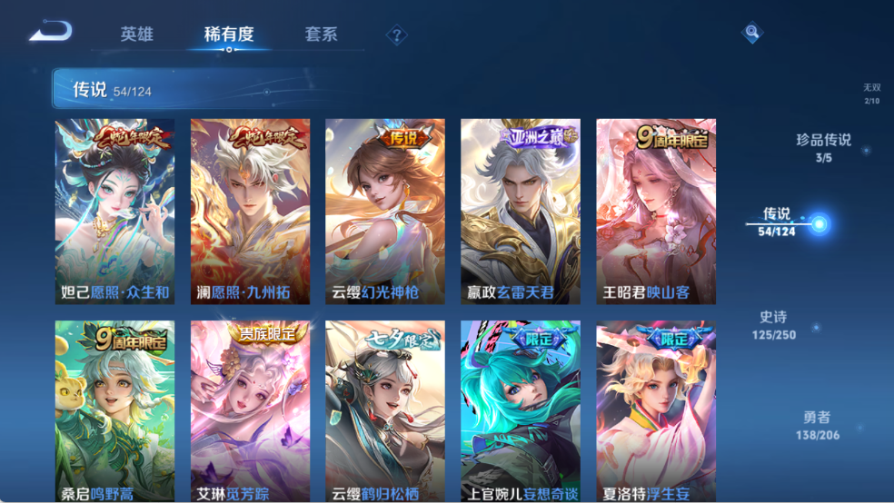 贵族等级V10,英雄数量125,典藏皮肤数5,皮肤数量403,