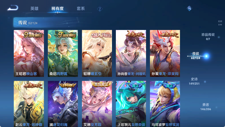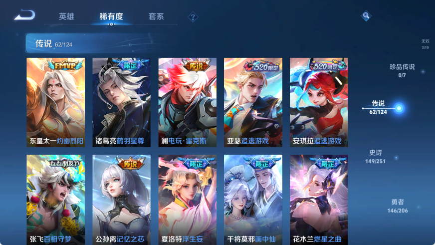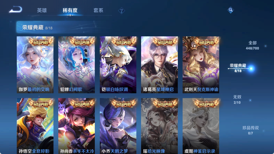 贵族等级V10,英雄数量124,典藏皮肤数8,皮肤数量448,天鹅之梦/全息碎影/倪克斯神谕/星域神启