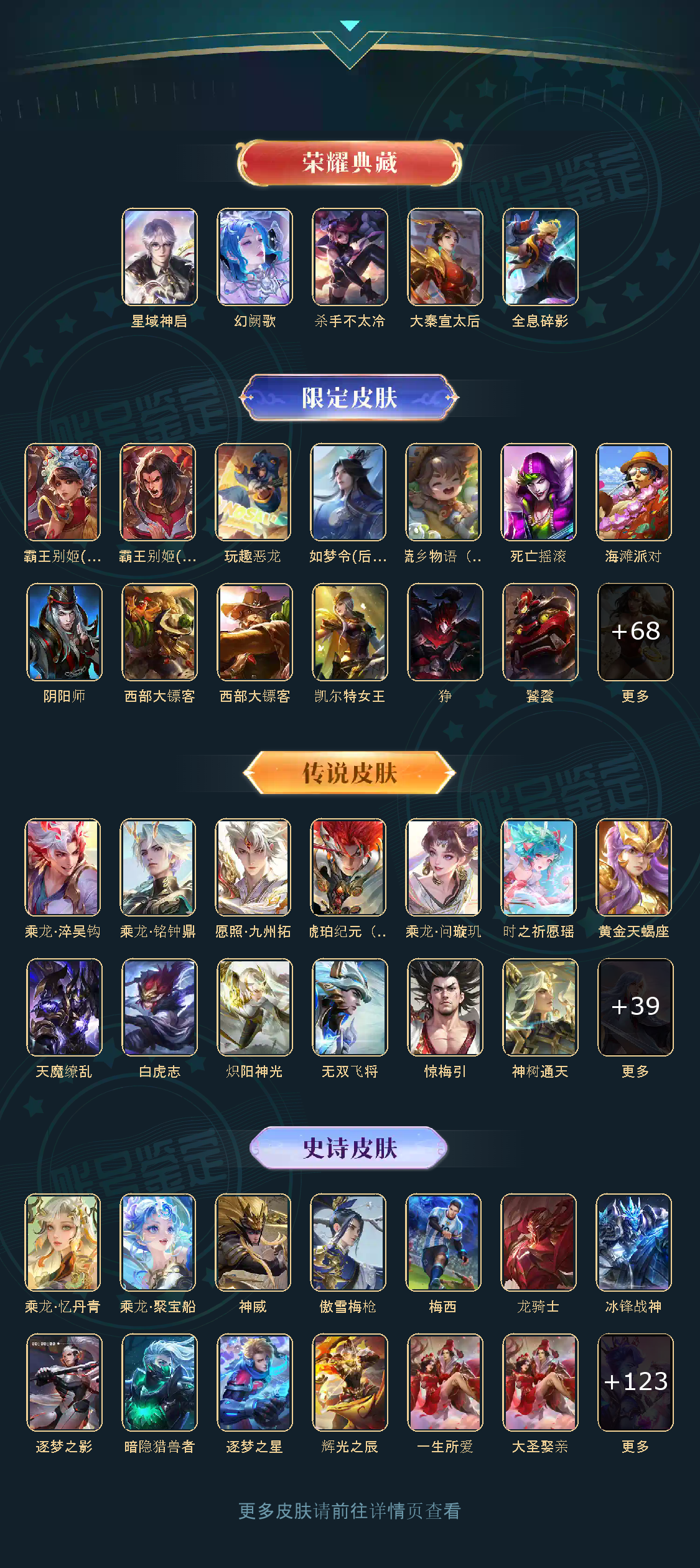 贵族等级V10,英雄数量123,典藏皮肤数5,皮肤数量443,杀手不太冷/大秦宣太后/全息碎影/星域神启
