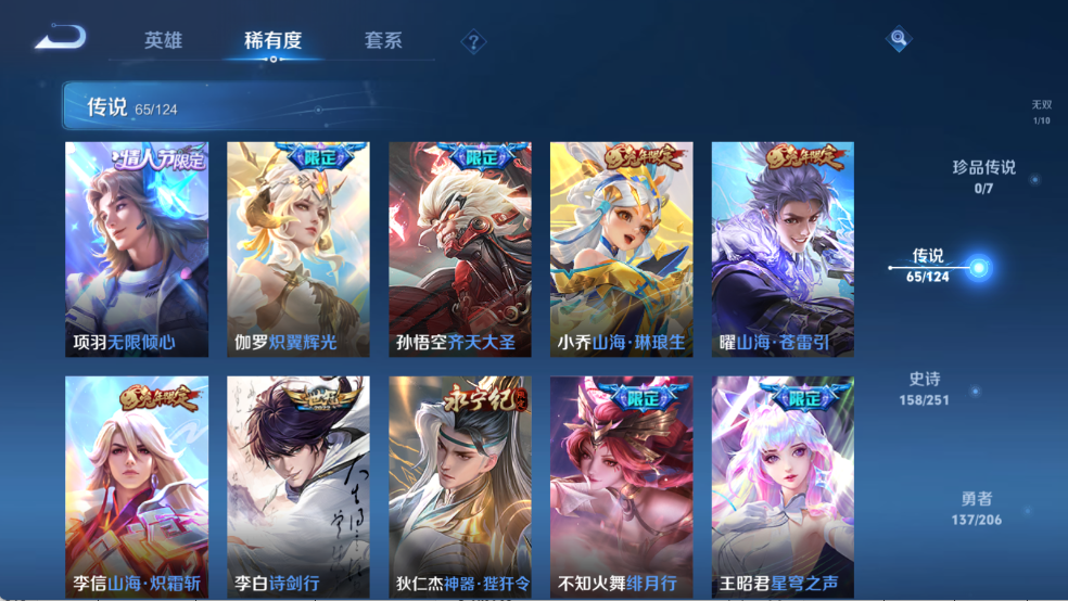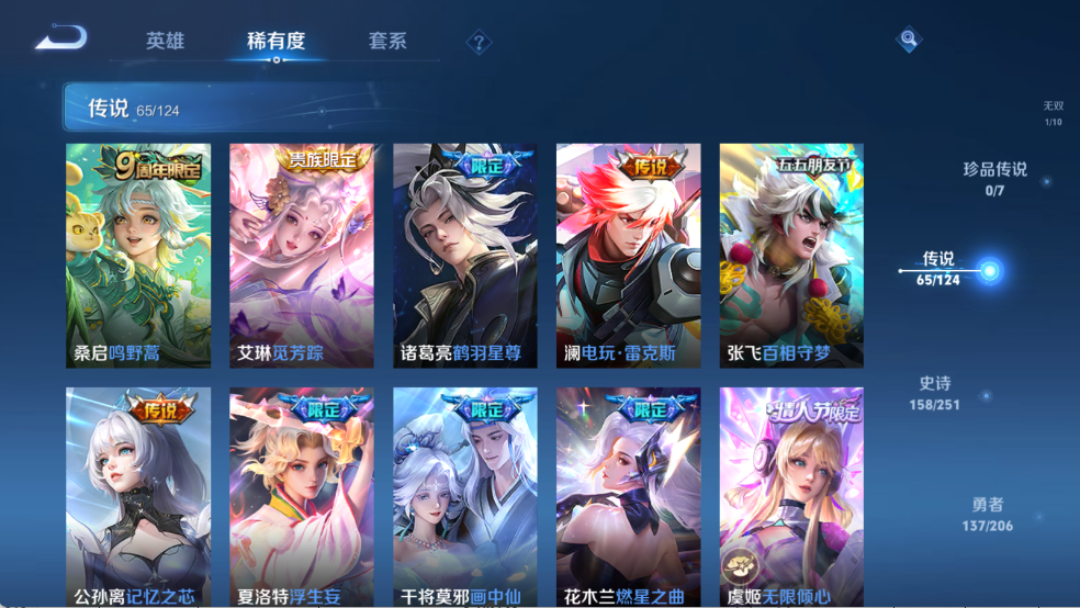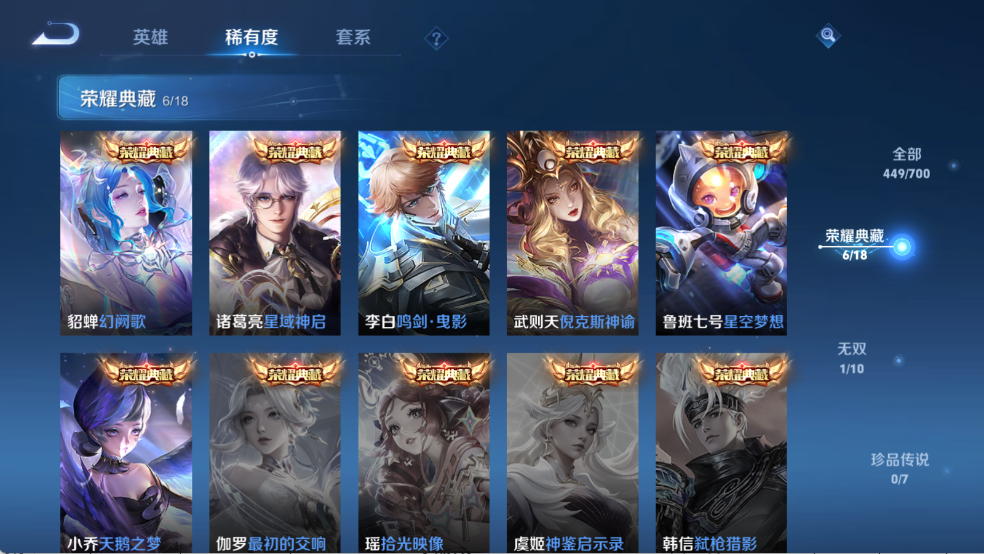 贵族等级V10,英雄数量123,典藏皮肤数6,皮肤数量449,