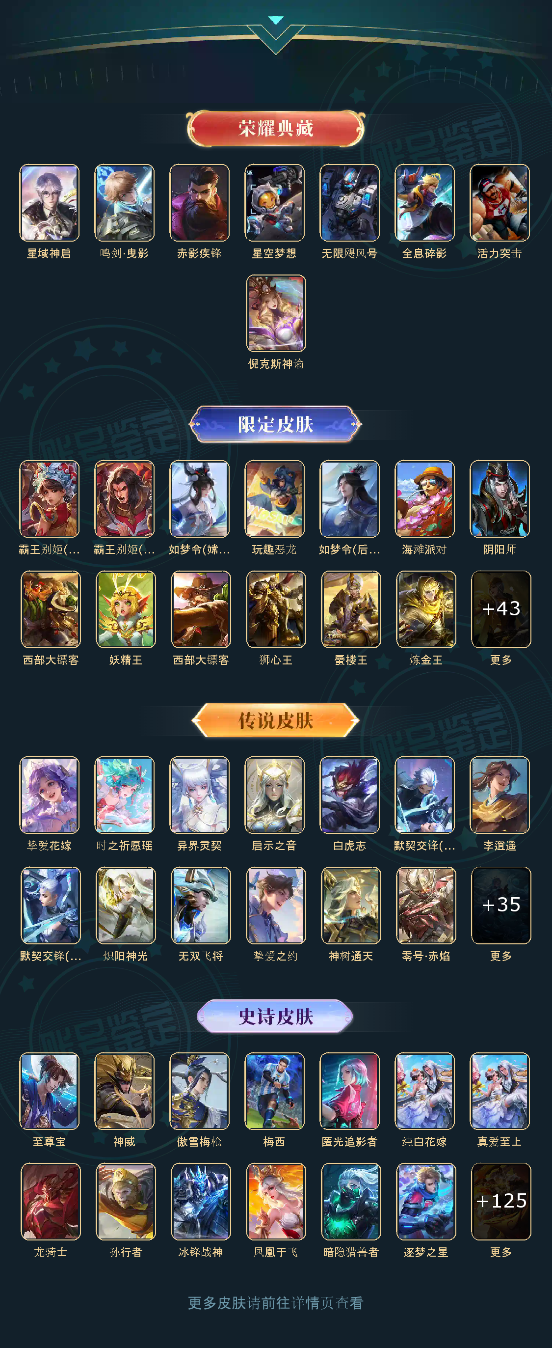 贵族等级V10,英雄数量124,典藏皮肤数8,皮肤数量410,