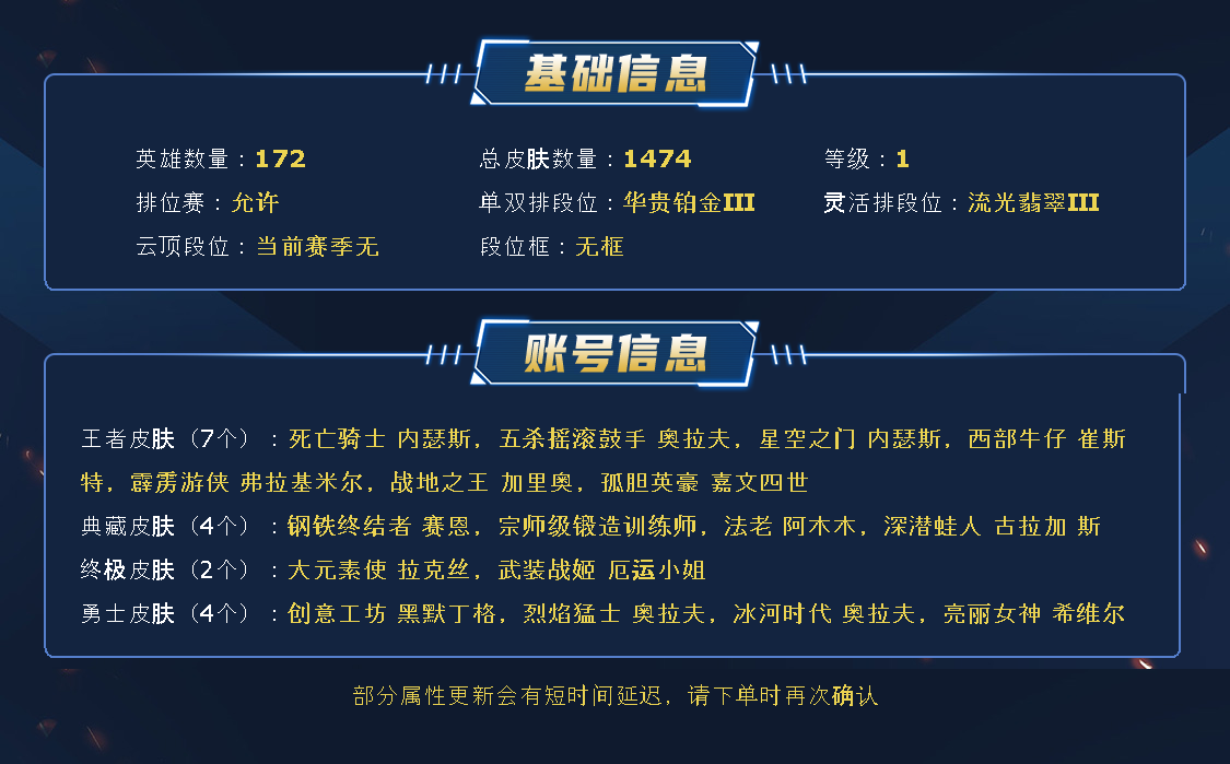 ~~喜欢记得收藏~~可排位~~1452皮全英雄丨941原皮511炫彩~~租之前尽量查一下游戏ID,确保段位是您需要的,避免浪费您的时间~~请勿挂机逃跑故意送人头,谢谢合作,谢谢~~