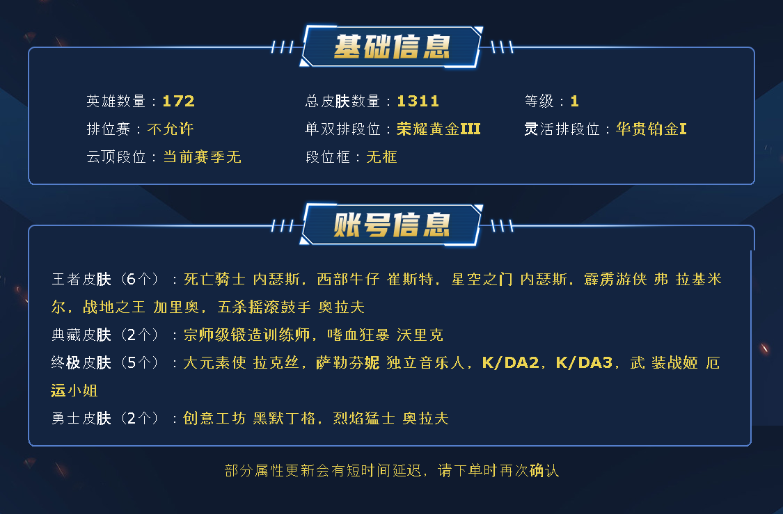 ~~喜欢记得收藏~~可排位~~1295皮全英雄~~租之前尽量查一下游戏ID,确保段位是您需要的,避免浪费您的时间~~请勿挂机逃跑故意送人头,谢谢合作,谢谢~~