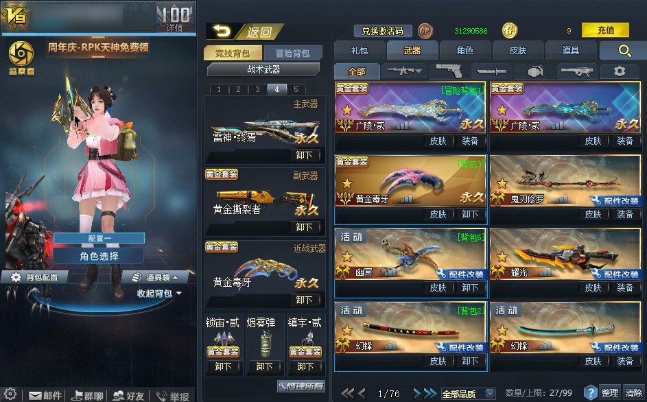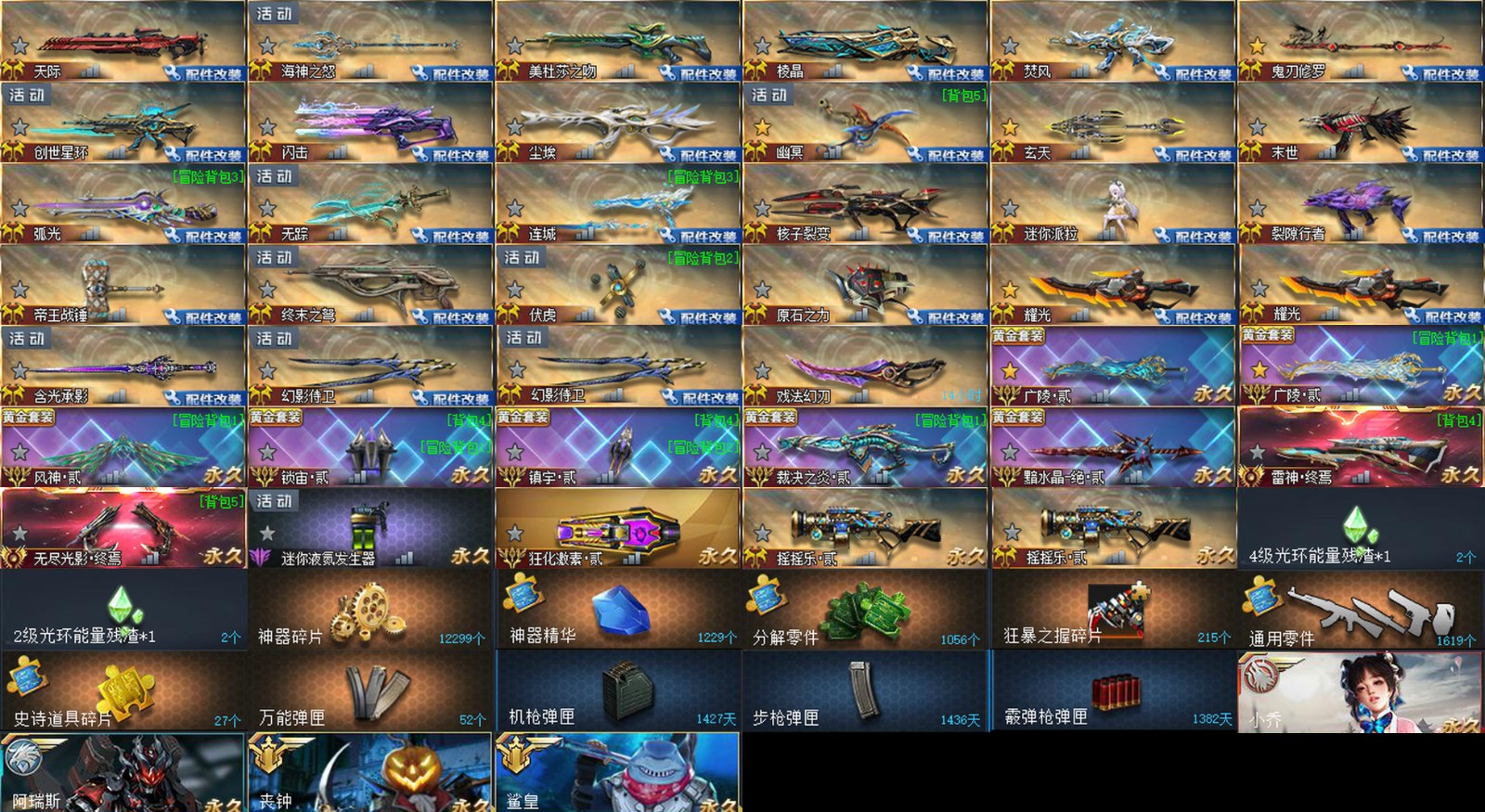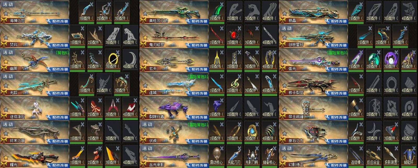 配件✨天际丨海神之怒丨美杜莎之吻丨棱晶丨焚风丨鬼刃修罗丨创世星环丨闪击丨尘埃丨幽冥丨玄天丨末世丨弧光丨无踪丨连城丨核子裂变丨迷你派拉丨裂隙行者丨帝王战锤丨终末之弩丨伏虎丨原石之力丨耀光 x2丨含光承影丨幻影侍卫 x2丨戏法幻刃丨