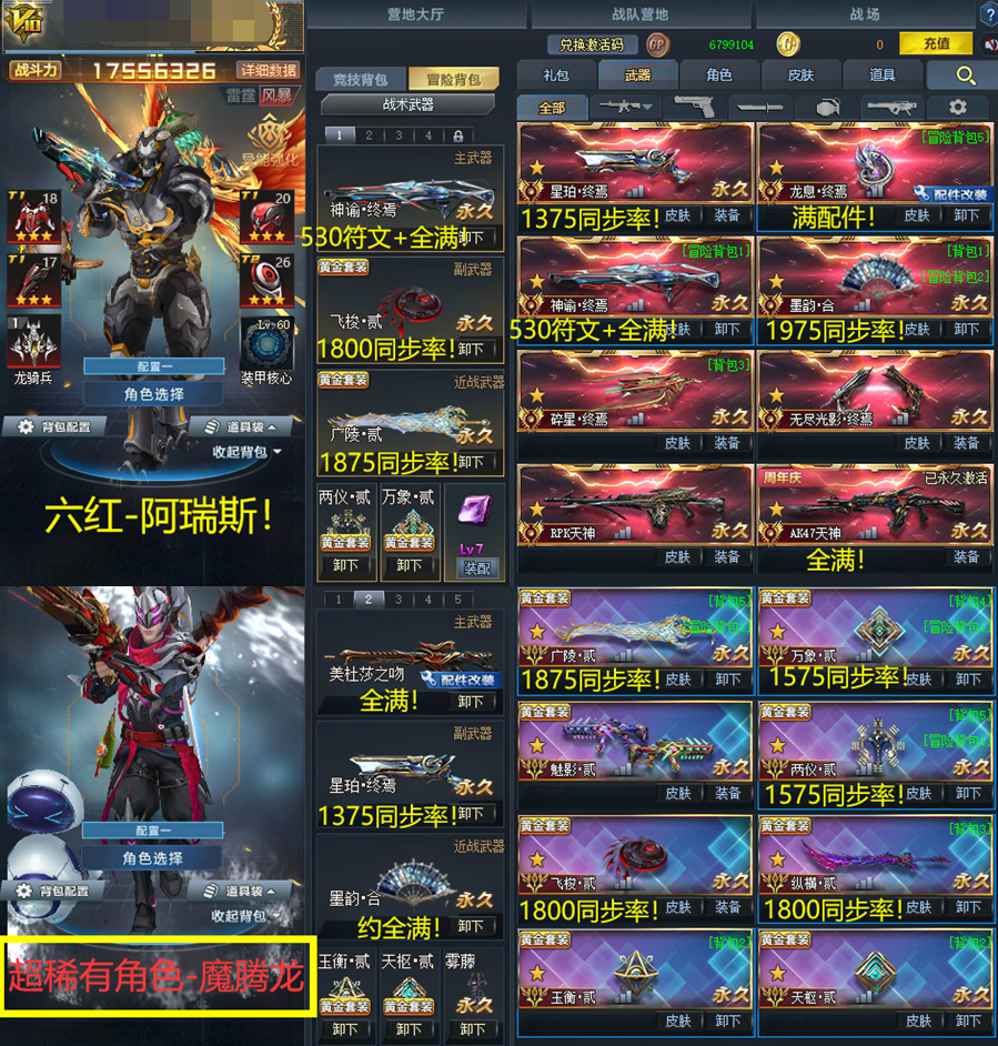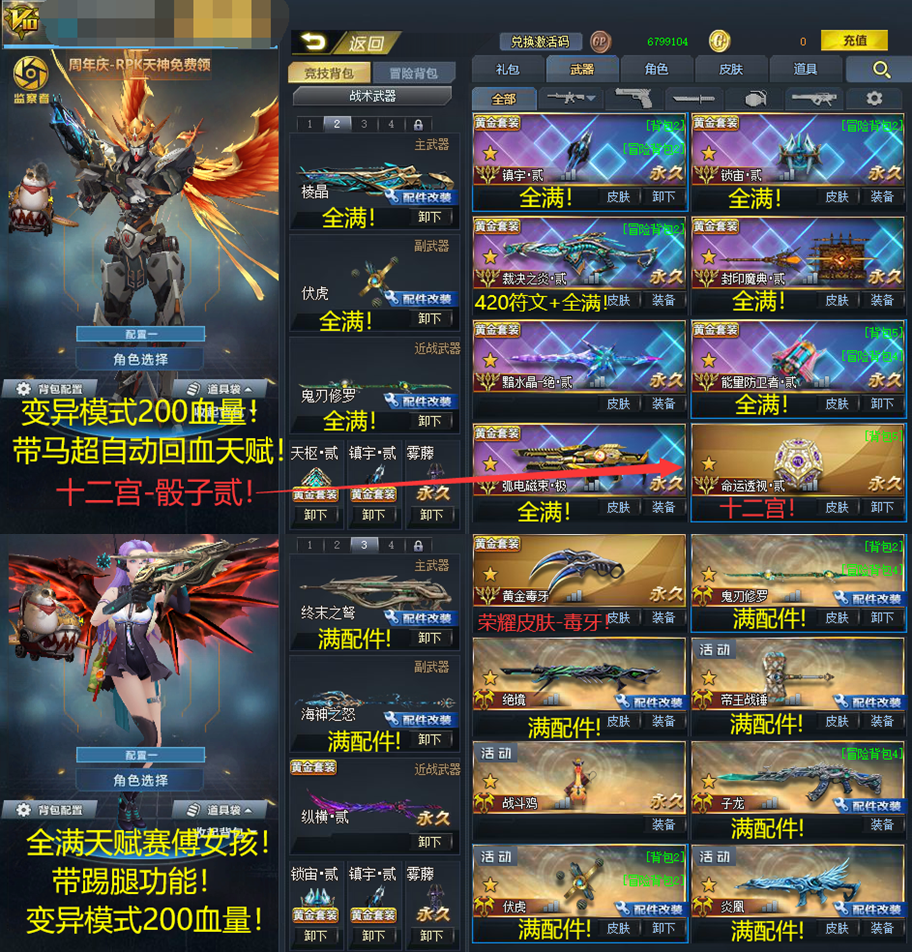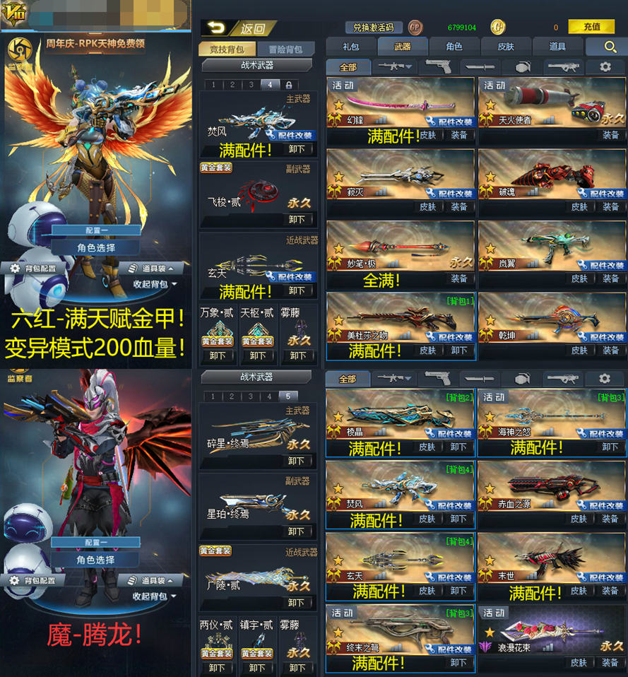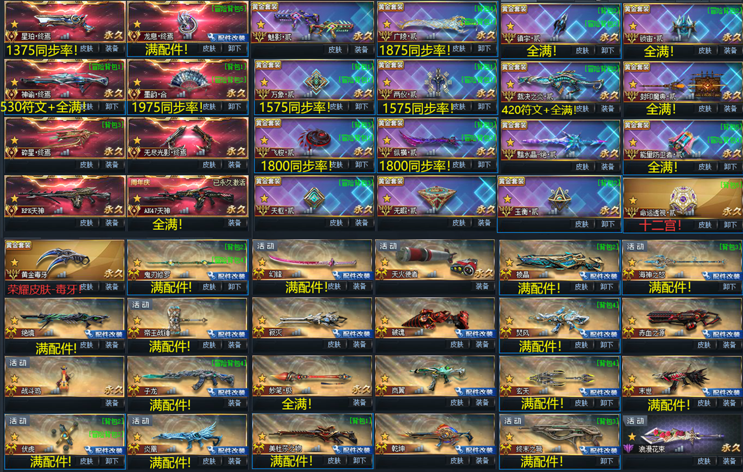 满配件武器:鬼刃修罗,绝境,帝王战锤,子龙,伏虎,冰•炎凰,幻锋,天火使者,妙笔极,美杜莎之吻,棱晶,海神之怒,焚风,玄天,末世,终末之弩…