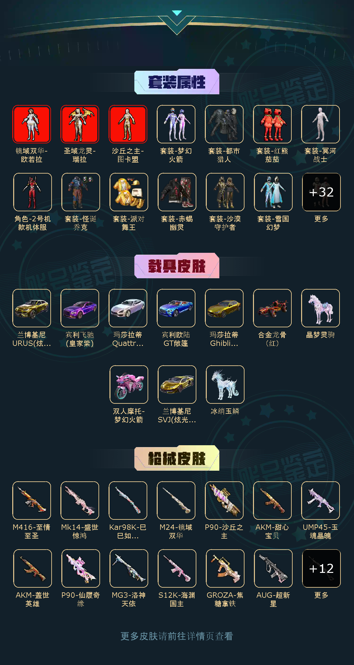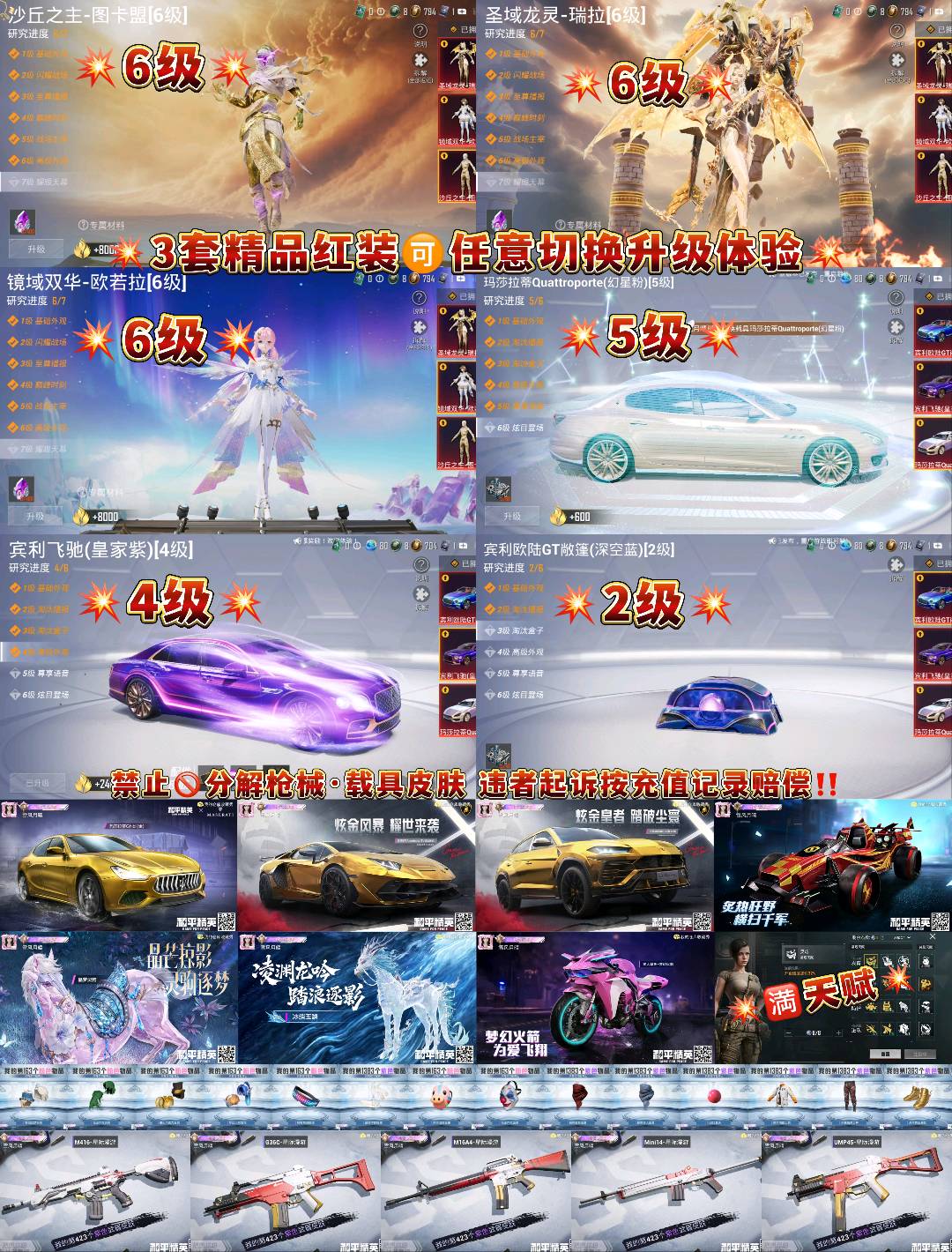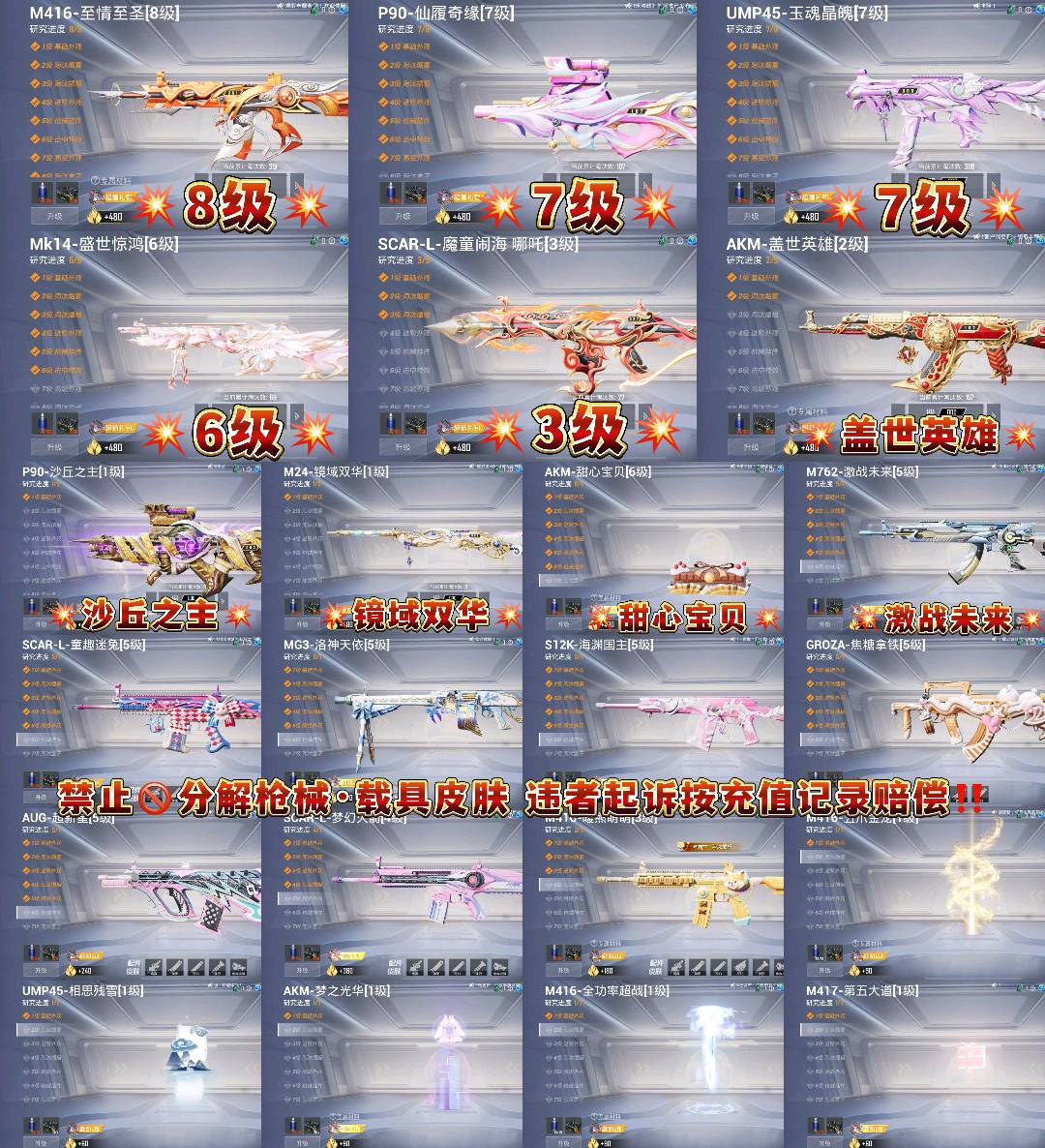 100粉,100载具,100特效枪,400套装,25王牌印记 UZI-绮梦青鸾/AKM-甜心宝贝/DP-28-扶摇飞仙/SCAR-L-梦幻火箭/SCAR-L-童趣迷兔/Kar98K-伏魔团/SKS-碧影闪光/M416-风花雪月/AUG-星之彼岸/SCAR-L-甜梦小狐/AWM-花间之火/M762-甜心娃娃/汤姆逊-怪笑疯兔/AWM-焰龙焚天/Vector-红伞翩翩/SKS-诡面斩/MG3-炙焰牛王/M762-激战未来/GROZA-香水柠檬/AWM-橘柚倾心/M416-心之恋语/平底锅-林间仙鹿/M16A4-葫芦兄弟/Mini14-荧光虫舞/M416-五爪金龙/M24-暗星紫秘/DP-28-枪炮玫瑰/DP-28-幻梦音符/AKM-炫紫旋律/Mini14-绚金瑰梦/MG3-洛神天依/GROZA-焦糖拿铁/SCAR-L-青春物语/M249-古战神甲/M762-冷魅冰骑/AKM-百合蜜语/UZI-筑梦精灵/SLR-暗夜玫瑰/S12K-海渊国主/VSS-烈焰拳霸/Kar98K-暗翼战神/UMP45-雪国精灵/M762-甜蜜誓约/UMP45-相思残雪/SCAR-L-机甲封神/M24-星之信仰/UMP45-恐龙拽拽/Mini14-龙虾霸霸/M249-蓝莓炮弹/野牛-流星咚咚/AKM-梦之光华/Kar98K-绿意幻情/路特斯EVIJA(星际黄)/兰博基尼Aventador(翡翠绿)/玛莎拉蒂Ghibli(金)/萌喵橘座/双人摩托-双刃魅影(绿)/阿斯顿·马丁DBX(橙)/特斯拉Model X(珍珠白)/俏皮小熊猫/路特斯ELETRE(冰川蓝)/兰博基尼URUS(炫光金)/特斯拉Roadster(尊享铂)/快艇-自由的鲸/海龙奔腾/特斯拉Roadster(沁心粉)/特斯拉Model 3(珍珠白)/玛莎拉蒂Ghibli(蓝)/阿斯顿·马丁DBS(红)/双人摩托-梦幻火箭/兰博基尼URUS(尊享铂)/特斯拉Model X(奇幻紫)/特斯拉Cybertruck(极昼黑)/特斯拉Cybertruck(荒芜蓝)/兰博基尼Estoque(炫光金)/金龙耀世/快艇-塞莎KL27(深潜蓝)/焰龙咆哮/兰博基尼URUS(明艳黄)/快艇-塞莎KL27(霓虹粉)/特斯拉Cybertruck(镭光铂)/双人摩托-双刃魅影(红)/兰博基尼Estoque(银翼灰)/双人摩托-双刃魅影(金)/合金龙骨(蓝)/灵鼠银迹/阿斯顿·马丁DBS(绿)/阿斯顿·马丁DBX(金)/特斯拉Model 3(奇幻紫)/特斯拉Model 3(冷光银)/合金龙骨(绿)/特斯拉Roadster(水滴蓝)/阿斯顿·马丁DBS(金)/路特斯ELETRE(花绽灰)/极速兔兔/鬼马风驰/南瓜骑士/合金龙骨(红)/兰博基尼Estoque(尊享铂)/玛莎拉蒂Ghibli(粉)/兰博基尼SVJ(尊享铂)/兰博基尼SVJ(炫光金)/软萌羊咩咩/快艇-塞莎KL27(鲸之蓝)/阿斯顿·马丁DBX(蓝)/特斯拉Model X(冷光银)