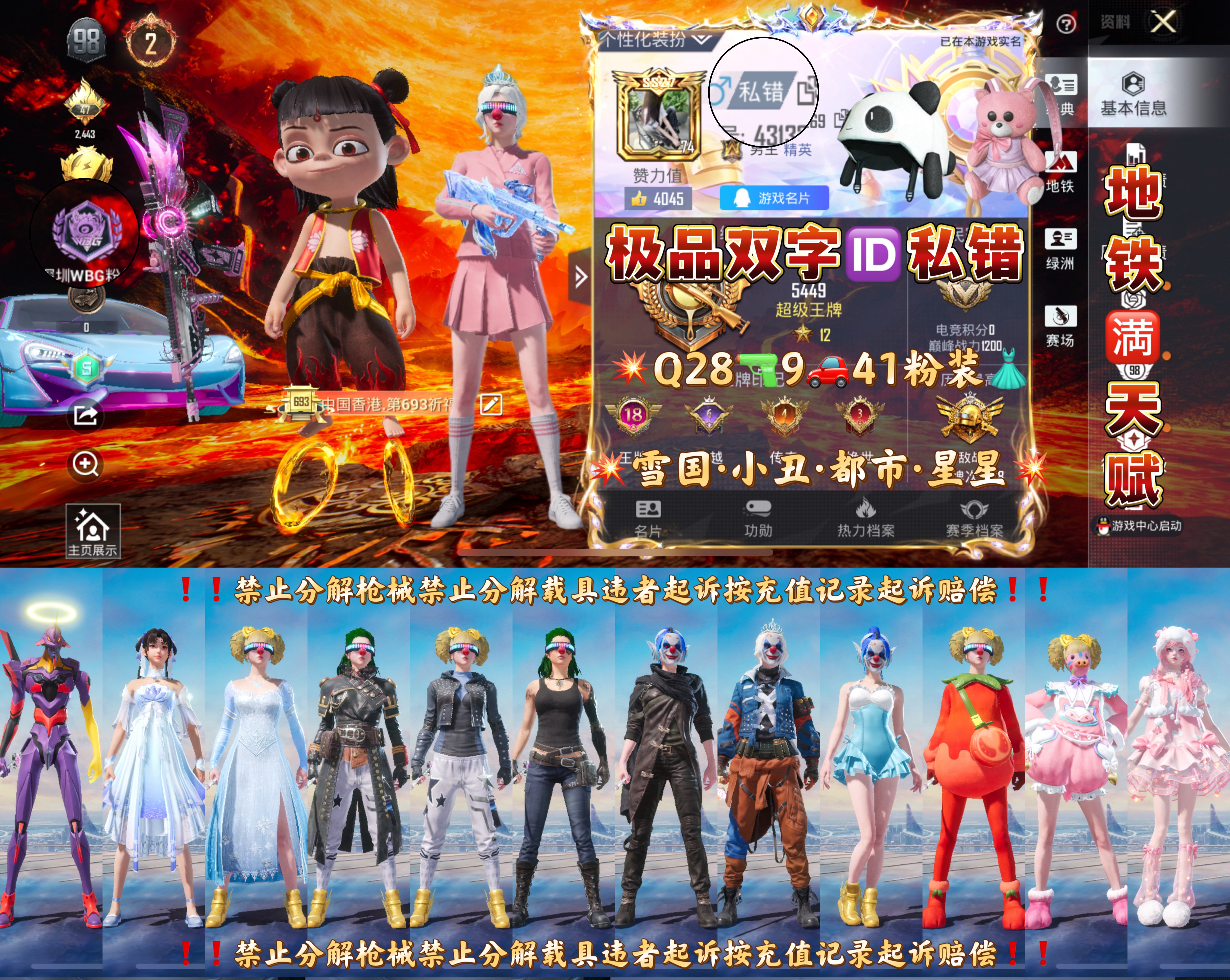恶意撤单一律拉黑 可直接上号 租客须知◆ 本账号已在公安局备案,请勿对账号做出非法操作 如:开挂,坐挂车,使用第三方工具等,请您和谐游戏,如有损害财务的情形必追究到底 登录游戏:登录请打开和平精英并勾选上同意协议,再点击开始登录即可,如跳转停留主页面无反应,!!!重新打开和平精英!!!!即可正常进入游戏 **:如账号触发账号系统,会为您补上时间,到时不会下线,直到下一位租客租赁账号为止 请尽量不要以**进行维权 恶意维权,恶意维权者进行拉黑处理,永不放出 关于登号器,登录请打开和平经营并勾选上同意协议,再点击开始登录即可,如跳转停留主页面无反应,重新打开和平精英即可正常进入游戏 如果您喜欢本账号,可以点个收藏 【该账号库存价值较大已在派出所进行虚拟财产备案处理发现封禁将依法追究责任 禁止毁号开第三方软件发现账号被封禁联系平台获取联系方式进行法院起诉故意损害他人财物处理】请勿以身试法。开G封号一律报警并法院起诉,追究到底! 别以为虚拟ip,虚拟卡就可以为所欲为,平台注册手机验证,身份证号或者ZF宝付款记录等太明显了,网络不是法外之地, 想想那些在网上违法诈骗的怎么被抓的? 做一件事的时候要考虑后果是不是你能承担的,想开G自己注册个新Q玩就行了, 租别人的号开G吃亏的还是自己,切勿抱有侥幸心理, 到时候被网监局刑事部门找上门,罚钱坐牢留下案底,亲人两行泪!恶意撤单一律拉黑