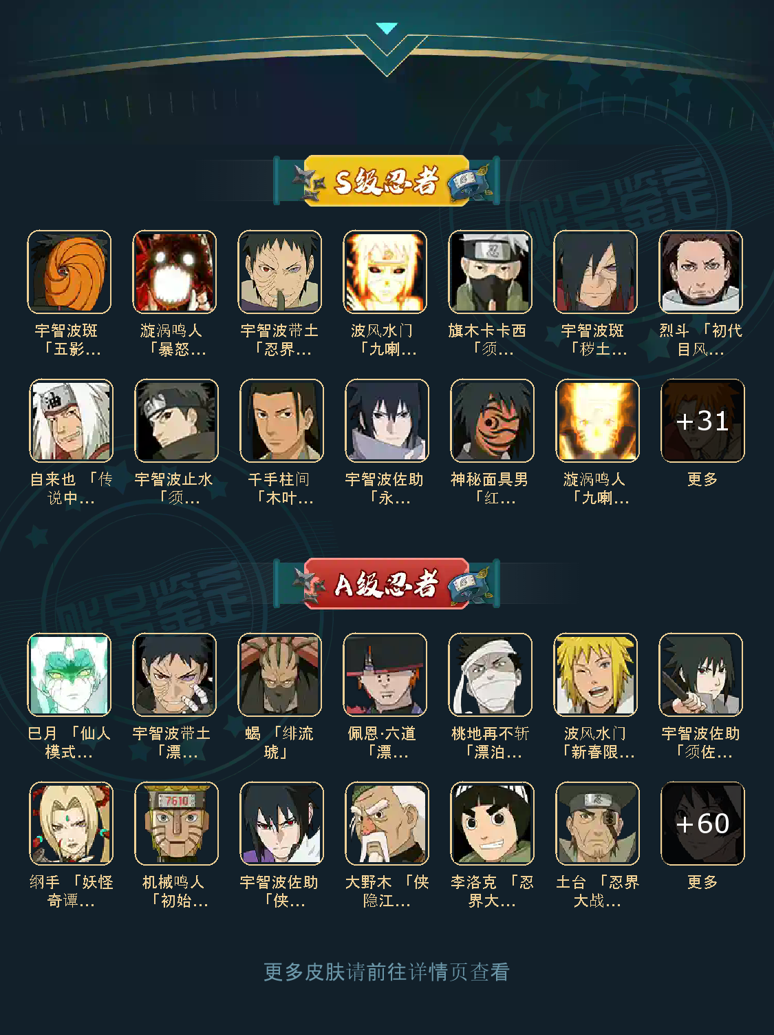 仙人自来也 纲手 波风水门 百战水门 猿飞日斩 千手柱间 宇智波斑 宇智波鼬 舞之自来也 大蛇丸 百战大蛇 秽土四代 秽土三代 秽土长门 仙人兜 黄猿九喇嘛鸣人 紫狗永恒佐助 樱婊忍战樱 秽土鼬 普通自来也 百豪纲手 死门凯 二代扉间 秽土二代 秽土初代 秽土柱间 白面具 须佐卡卡西 小胡子鬼灯幻月 雷影 土影 无 佩恩 百战佩恩 青年柱间 创立初代 秽土斑 青年斑 解斑 须佐止水 虎皮 破面带土 红夜带土 罗砂 秽土三代风影 忍战雷影 三代雷影 金角银角 秽土半藏 忍战大野木 小土豆 天道超 大筒木桃式 大筒木金式 钢铁之躯凯 桀骜之刃阿斯玛 狂野之鲨鬼鲛 飞段 黑飞段 百豪樱 忍战李 大卡卡西 五代水影照美冥 宇智波鼬 仙鸣 九尾查克拉鸣人 鹰佐 奇拉比 青年艾 半蛇兜 晓蛇 新春鼬 面麻 须佐佐助 疾风咒印佐助 忍战宁次 忍战天天 最终章雏田 幻容卡卡西 神卡 忍战卡卡西 泳装卡卡西 忍战凯 青春哥 惊门凯 爱情哥 新春止水 新春水门 青年水门 青水 新春我爱罗 泳装照美冥 侠隐照美冥 侠隐纲手 侠隐兜 漂泊再不斩 漂泊佩恩 漂泊二代 漂泊小南 漂泊佩恩 三船 青年三船 青年长门 泳装南 新春南 绝 新春大蛇丸 晓创生角度 晓创生蝎 晓创生飞段 泳装鼬 鲛肌融合鬼鲛 新春迪达拉 秽土迪达拉 恶灵之影飞段 暴怒带土 忍战黄土 卑留呼 桃博 黑土