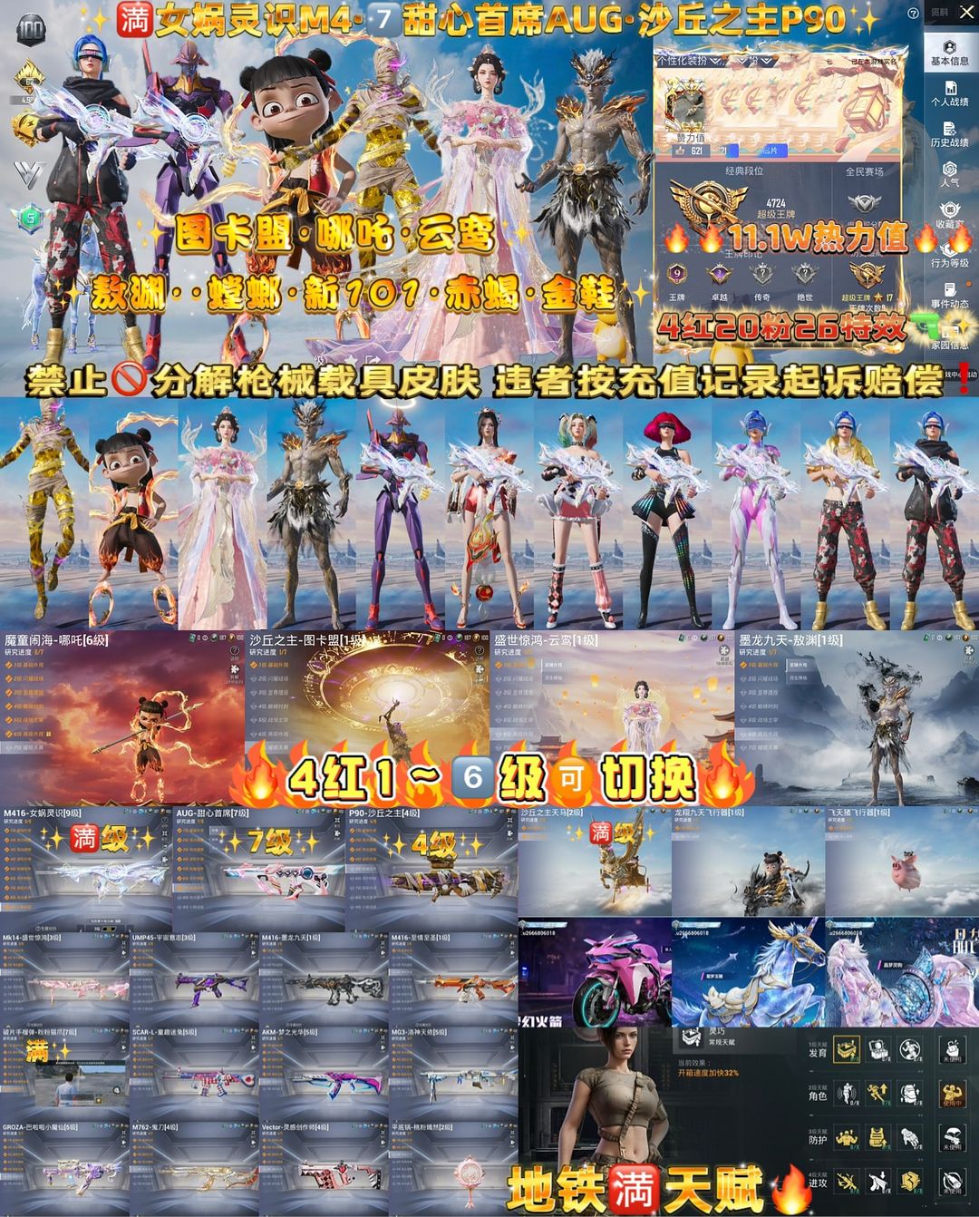 【苹果】 6级哪吒图卡盟云鸾敖✨9级女娲灵识✨9级甜心首席AUG✨新老螳螂赤歇金鞋✨101红眼罩✨地铁🈵天赋