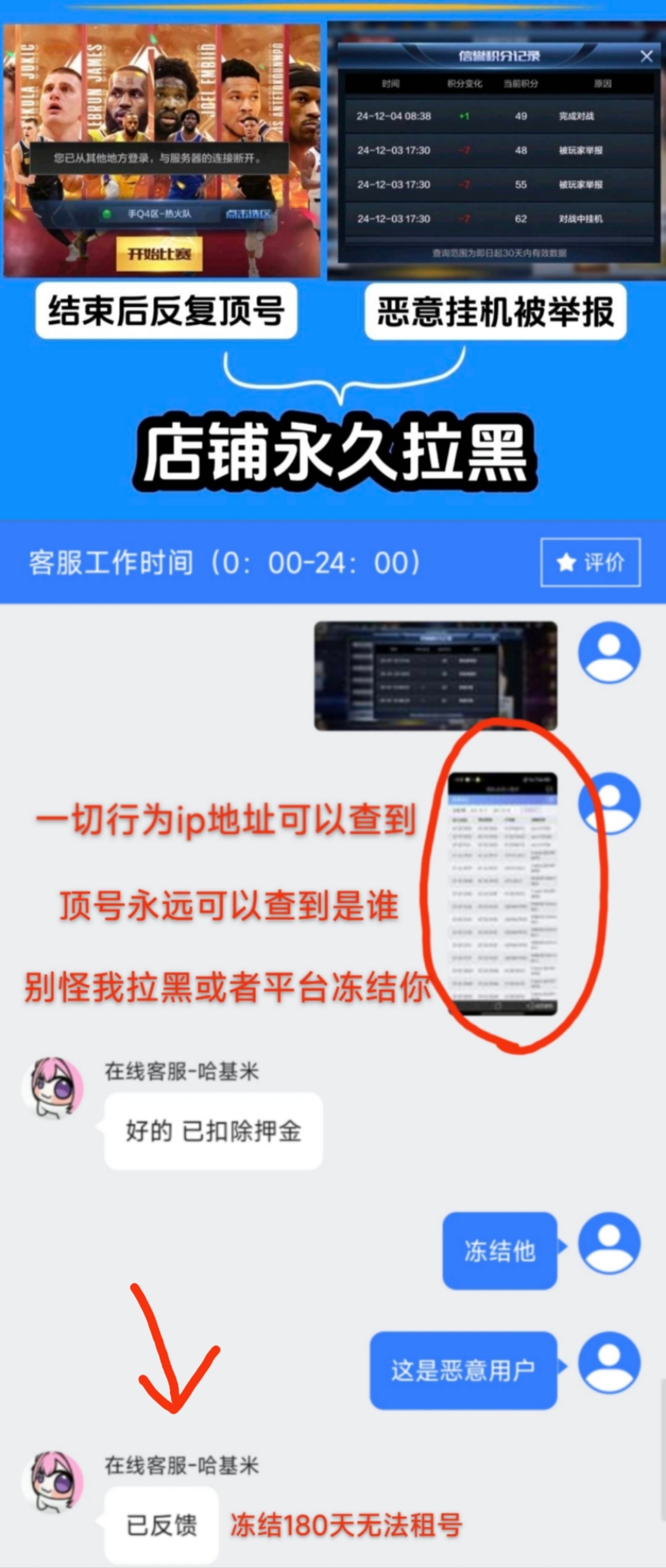 2、结束后多次顶号导致下架(ip地址可以查到)