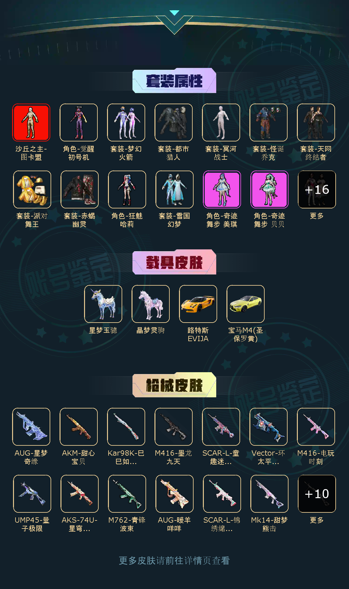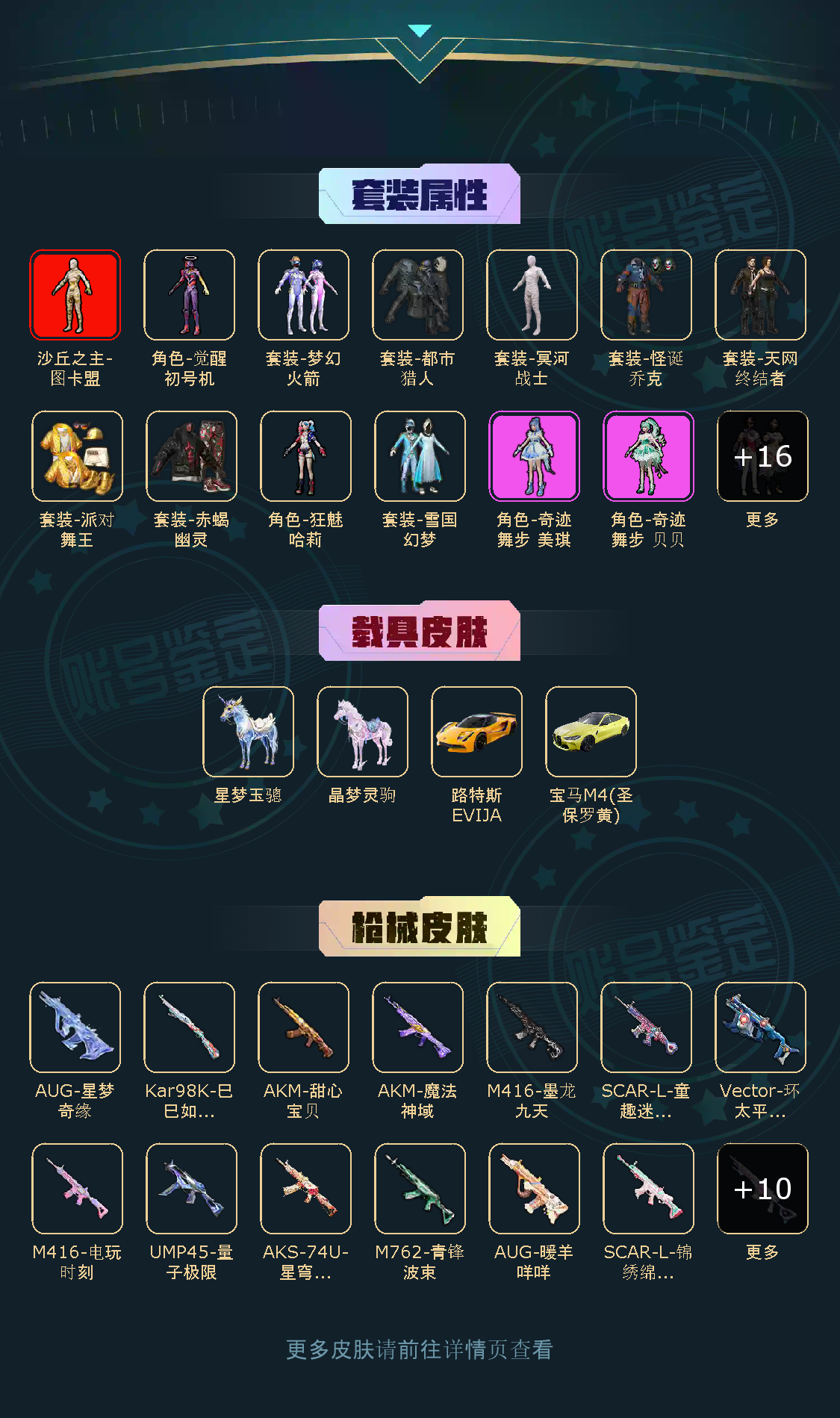 24粉,4载具,269套装,16王牌印记,无敌战神历史最高段,130973热力值 平底锅-林间仙鹿/AKM-甜心宝贝/SCAR-L-童趣迷兔/AUG-星梦奇缘/M416-电玩时刻/M416-暖熊萌萌/SCAR-L-纯梦嫁纱/AKM-魔法神域/GROZA-精灵之光/M762-青锋波束/AUG-暖羊咩咩/M416-墨龙九天/GROZA-焦糖拿铁/SCAR-L-锦绣绵绵/AKM-梦之光华/Mk14-甜梦熊击/DP-28-千金淑猫/DP-28-豹影疾电/UMP45-量子极限/AKS-74U-星穹咏叹调/Vector-环太平洋/破片手榴弹-秋玉花灯/Kar98K-巳巳如意/宝马M4(圣保罗黄)/路特斯EVIJA(星际黄)/星梦玉骢/晶梦灵驹/