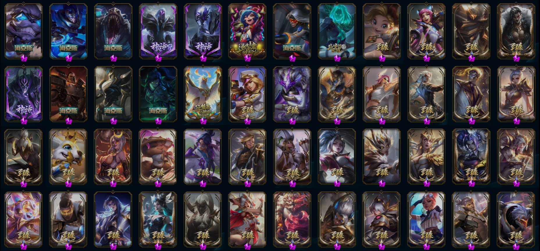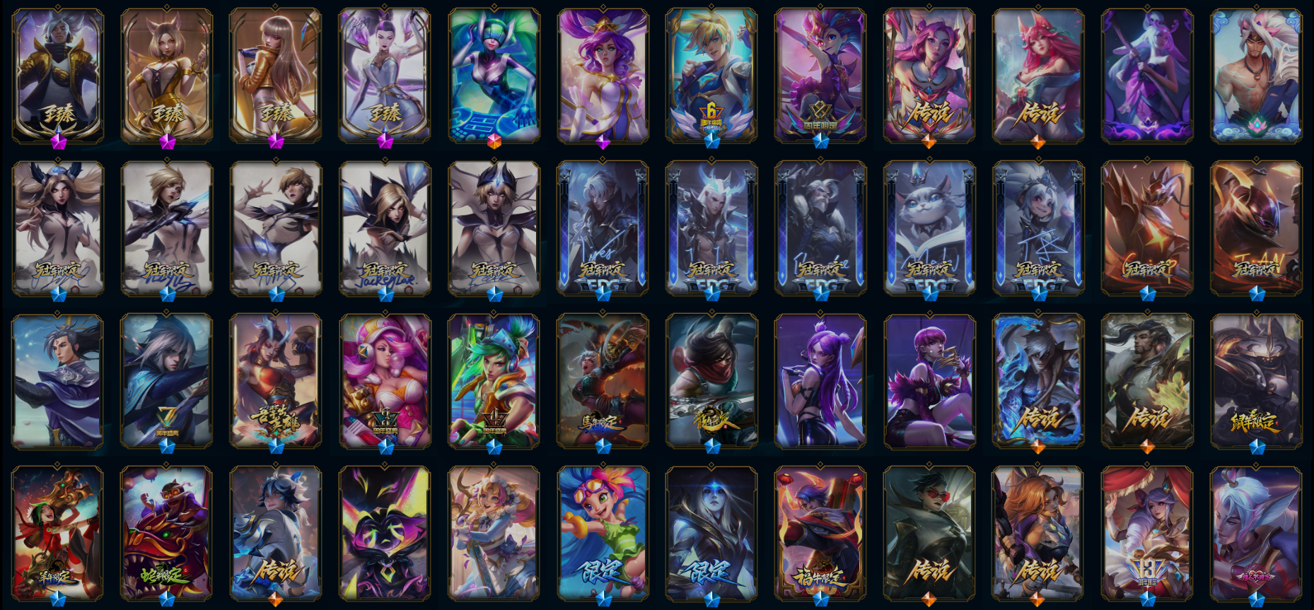 【传说皮肤】偶像歌手阿狸 钢铁之翼凯尔 至尊魔女莫甘娜 幻灵战斗队长厄运小姐 光明哨兵薇恩 钢铁军团盖伦 第三类接触黑默丁格 神龙尊者昼日真龙亚索 太空律动猫猫布里和里茨 鬼魂新娘莫甘娜 银河魔装机神兰博 日蚀骑士希维尔 冰川巨兽墨菲特 腥红之月鬼武姬阿卡丽 神王盖伦 驯龙学者黑默丁格 屠龙勇士潘森 青花瓷伊泽瑞尔 灵魂莲华阿狸 战斗学院伊泽瑞尔 星之守护者卡莎 暗星锤石 黯晶凤凰艾尼维亚 恶魔男爵瑞兹 欧米伽小队幽灵特工 暗星尊烬 黯黑魔龙希瓦娜 西部天使艾希 真实伤害艾克 神龙尊者圣龙李青 邪鸦魅影乐芙兰 枯萎之壤泽拉斯 驯龙炮手崔丝塔娜 地狱行者孙悟空 大天使长米迦勒凯尔 约德尔国队长提莫 焰尾妖狐阿狸 苍穹之光韦鲁斯 星之守护者洛 星之守护者霞 绅士科加斯 烈焰雄心崔丝塔娜 霸天零式赛恩 泳池派对吉格斯 符文战熊沃利贝尔 女皇艾希 女主播迦娜 战地巨兽科加斯 西部魔影卢锡安 炼狱魔犬内瑟斯 宇航员诺提勒斯 冰霜之刃艾瑞莉娅 黑夜使者亚索 铁哥们儿奥拉夫 合金巨兽努努和威朗普 电玩女神娑娜 战场女武神凯尔 律政大亨蒙多 霸天异形卡兹克 未来战士凯特琳 星之守护者金克丝 星之守护者拉克丝 苹果机器人布里茨 红色男爵库奇 血石领主弗拉基米尔 战地机甲厄加特 提莫约德尔人的一大步 地狱之门卫士加里奥 最终BOSS维迦 双重冰晶艾尼维亚 灌篮高手德莱厄斯 黎明使者锐雯 女校长菲奥娜 神拳李青 源计划联合艾希 上古战魂魔腾 源计划林易 魔幻卡牌崔斯特 死亡骑士盖伦 金牌主播德莱文 恶魔之刃泰达米尔 冰霜亚龙希瓦娜