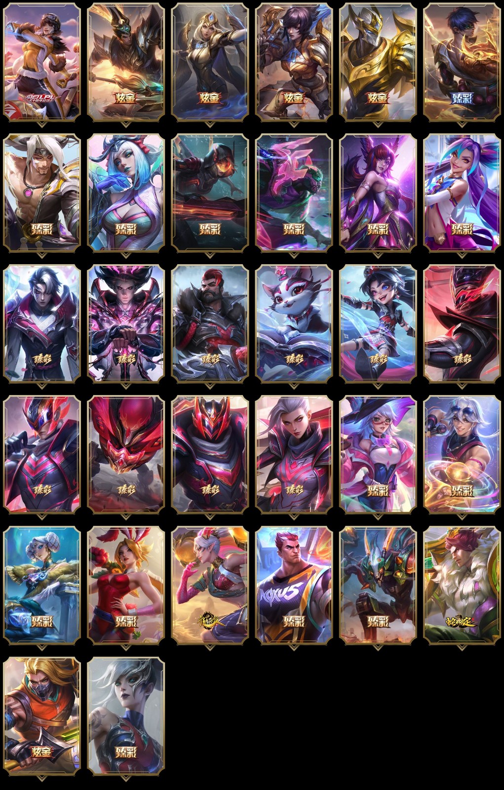 【重要炫彩】无畏骑士瑟庄妮赤子初心 吕布奉先炫金战神 冠军之箭艾希凯旋圣装 冠军之刃锐雯2016凯旋圣装 冠军之隐劫凯旋圣装 神龙尊者圣龙李青龙腾云起 灵魂莲华亚索霜见 净雪之月莫甘娜冬虹 源计划联合艾希红莲之弓 源计划毁灭派克幻灭 西部魔影卢锡安圣辉牛仔 星之守护者霞烈羽 星之守护者金克丝黑洞 天煞劫黑洞 战斗学院伊泽瑞尔白金学长 灰烬征服者潘森余烬觉醒 可爱可爱粉红红悠米 奥德赛金克丝恒星游历者 源代码乐芙兰梦幻闪击 黎明使者奈德丽霞辉 光明骑士奎因诡秘守望者 音浪狂舞莎弥拉 泳池派对塔莉垭海豚剧院 黎明使者薇古丝霞辉 女校长菲奥娜梦幻的倩影 霸天异形卡兹克变革特攻 西部魔影地狱列车长莫德凯撒忠诚 千纸双子努努和威朗普紫苑 怨之砂派克绯幻 奈落之炎慎骄傲之焰 可爱可爱粉红红提莫 西部魔影送葬人图奇忠诚 永恒之森维迦致幻菇 神凰行者瑞羽圣凰艾尼维亚仙翰 糖果大战布隆樱桃夹心饼 地狱火加里奥骄傲之焰 可爱可爱粉红红克格莫 可爱可爱粉红红玛尔扎哈 永恒之森雷克塞樱落 勇者阿狸炫金 EDG厄斐琉斯破军 EDG佛耶戈破军 EDG格雷福斯破军 EDG悠米破军 EDG佐伊破军 FPX锤石涅槃 FPX李青涅槃 FPX墨菲特涅槃 FPX普朗克涅槃 FPX薇恩涅槃 幻灵战斗兔阿萝拉梦幻强袭 冲击之刃劫风魔上忍 暗影沃里克至真至诚 生化魔人扎克草莓软糖魔人 皮城女警凯特琳死亡蔷薇 心之钢伊泽瑞尔天纵才华 星之守护者卡莎希望之光 北极星钢影卡蜜尔智慧纽带 红莲之刃锐雯 天龙之子卡莎飞龙乘云 灌篮高手德莱厄斯金色神话 霸天异形卡兹克丛林灾厄 剪纸仙灵嘉文四世日进斗金 墨之影武者亚索金墨耀影 魔女阿卡丽虚荣