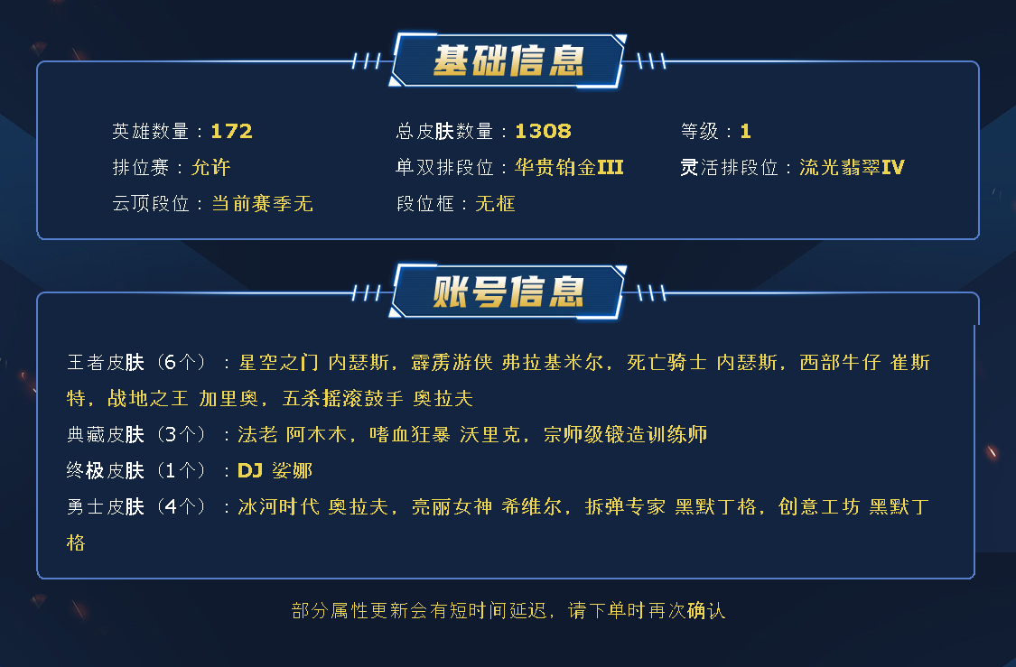 ~~喜欢记得收藏~~可排位~~1271皮全英雄丨860原皮411炫彩~~租之前尽量查一下游戏ID,确保段位是您需要的,避免浪费您的时间~~请勿挂机逃跑故意送人头,谢谢合作,谢谢~~