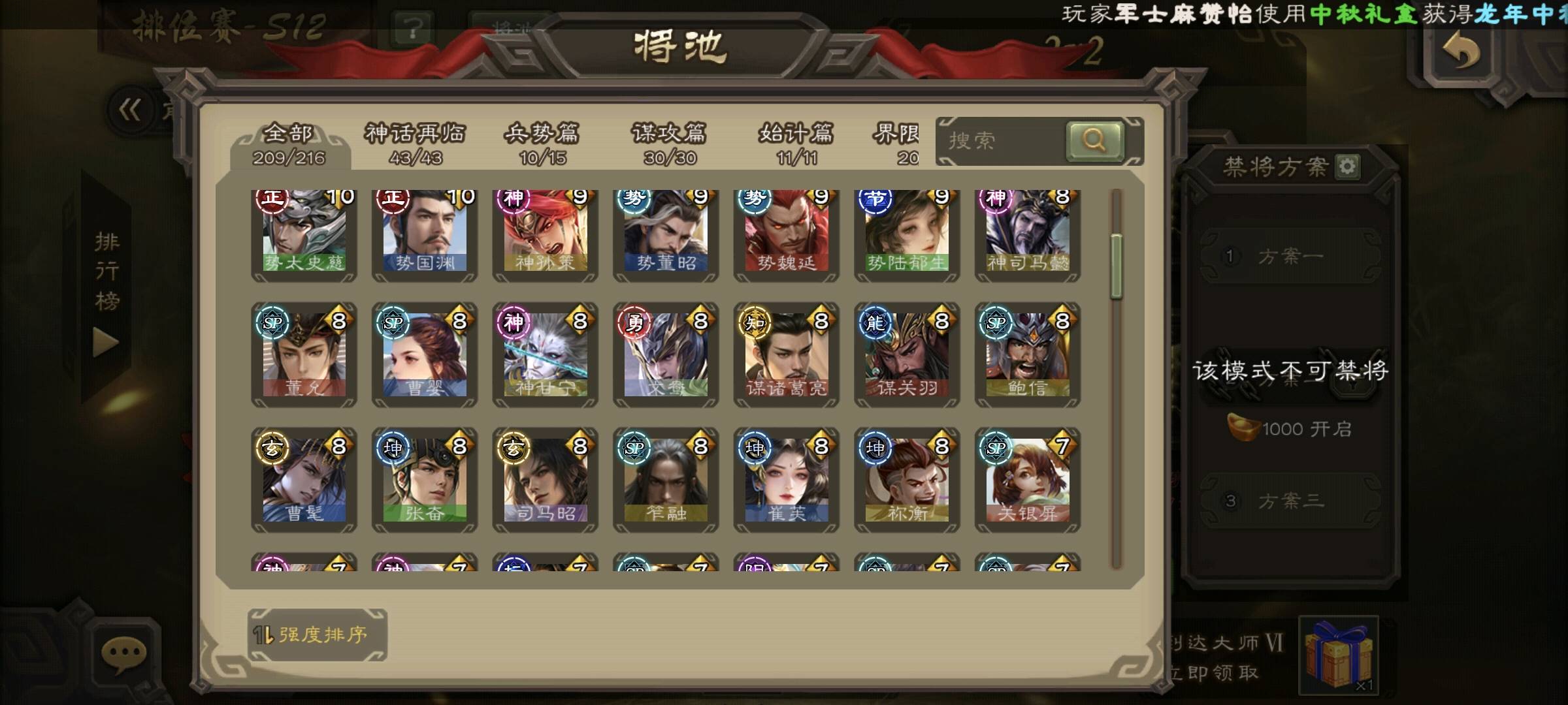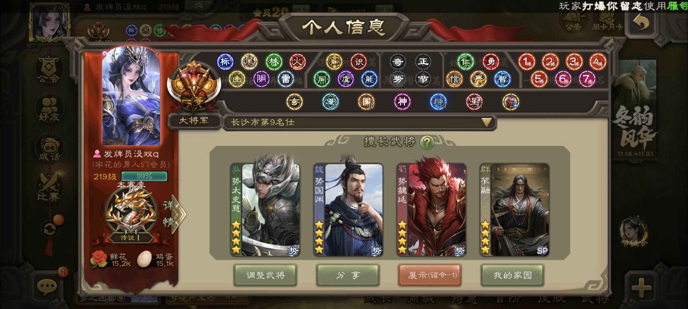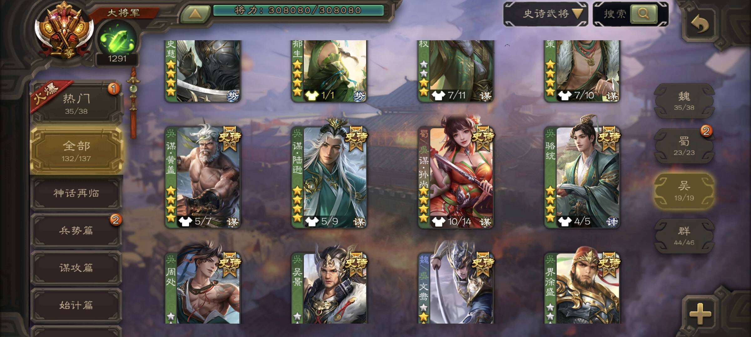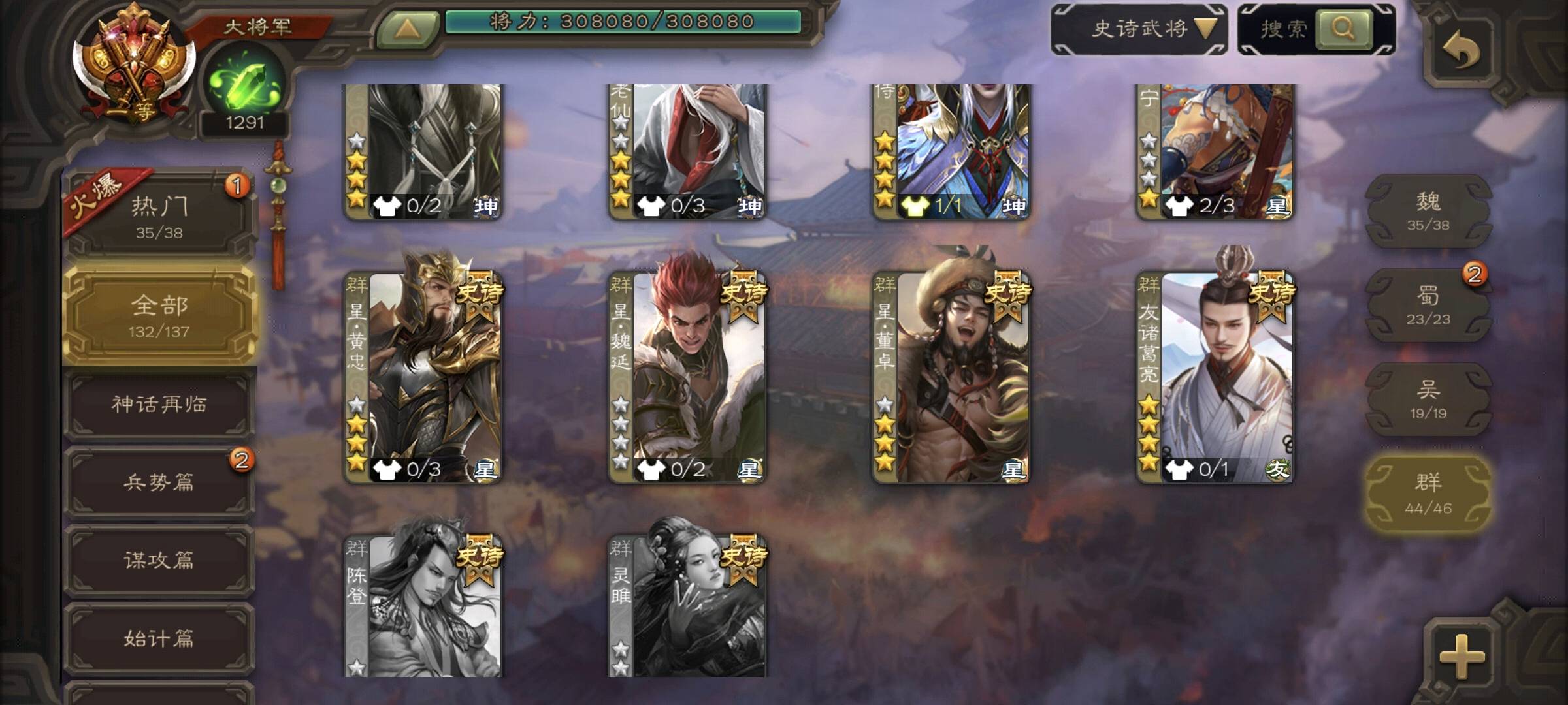 群——左慈,许攸,谋貂蝉,杜预,刘璋,界左慈,沮授,界李儒,张让,麹义,陶谦,士燮,司马徽,卑弥呼,刘焉,王允,苏飞,公孙康,兀突骨,祢衡,庞德公,郑玄,星甘宁,张仲景,黄甫嵩,界沮授,审配,徐荣,陈登,张琪瑛,灵雎,杨彪,裴秀,十常侍,星黄忠,星魏延,谋公孙瓒,友诸葛亮,星董卓,势于吉,势吕布,笮融