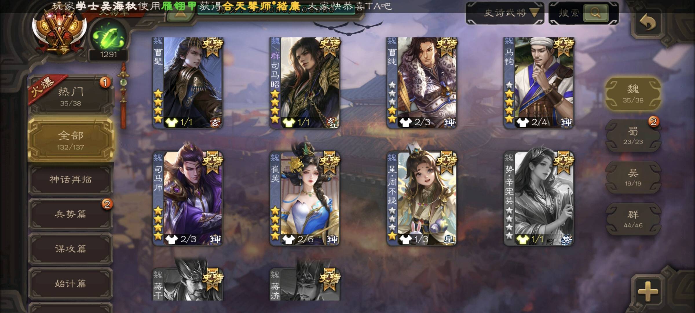 魏——郝昭,谋曹操,谋曹仁,王粲,王凌,文鸯,张昌蒲,界于禁,界钟会,界曹真,熙康,程昱,戏志才,杨修,陈琳,王朗,刘哔,王元姬,羊徽瑜,sp司马昭,曹纯,马钧,司马师,曹婴,郭女王,星周不疑,谋曹丕,蒋干,谋夏侯惇,曹髦,势董昭,势国渊,清河公主,谋郭淮