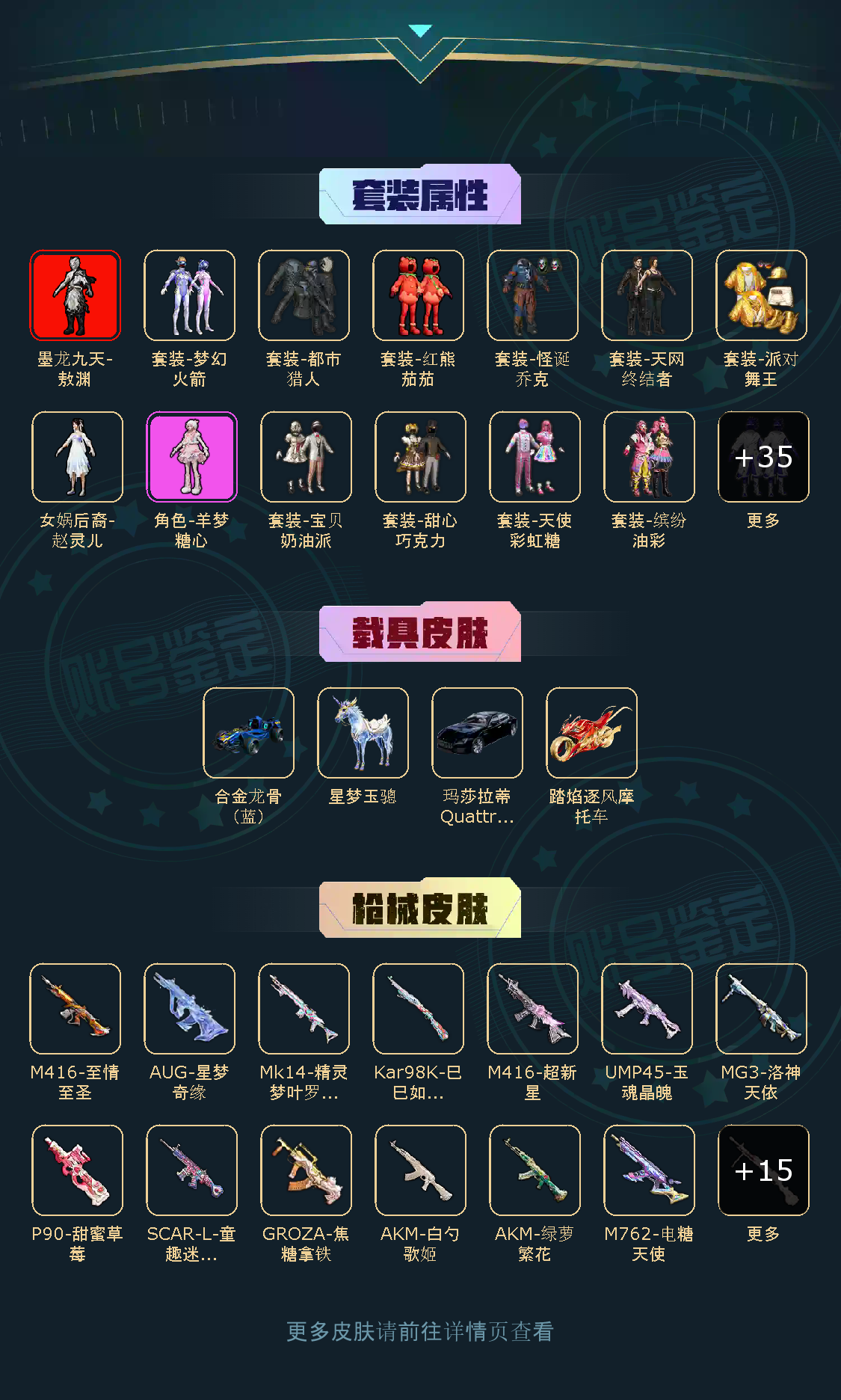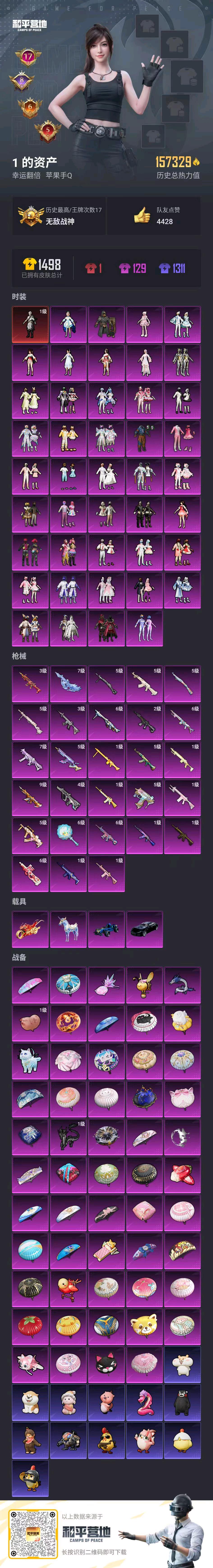 44粉,4载具,274套装,17王牌印记,无敌战神历史最高段,157329热力值 平底锅-仲夏莫吉托/SCAR-L-童趣迷兔/AUG-星梦奇缘/AKM-绿萝繁花/M762-电糖天使/M416-心之恋语/M416-五爪金龙/M16A4-垂柳戏鸭/AKM-白勺歌姬/M416-墨龙九天/GROZA-焦糖拿铁/SCAR-L-青春物语/M416-至情至圣/AKM-星际浪客/AUG-超新星/M416-超新星/SCAR-L-魔童闹海 哪吒/M417-第五大道/Mk14-精灵梦叶罗丽/Mk14-闲梦青缨/MG3-酷泡奶龙/MG3-洛神天依/DP-28-千金淑猫/DP-28-豹影疾电/UZI-绮梦青鸾/P90-甜蜜草莓/UMP45-玉魂晶魄/Kar98K-巳巳如意/玛莎拉蒂Quattroporte夜幕蓝/合金龙骨(蓝)/星梦玉骢/踏焰逐风摩托车/